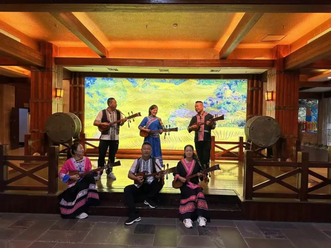 中心酒店大堂每天定时开展琵琶迎宾演奏及互动表演,用最原始古朴的方式,欢迎远到而来的宾客;