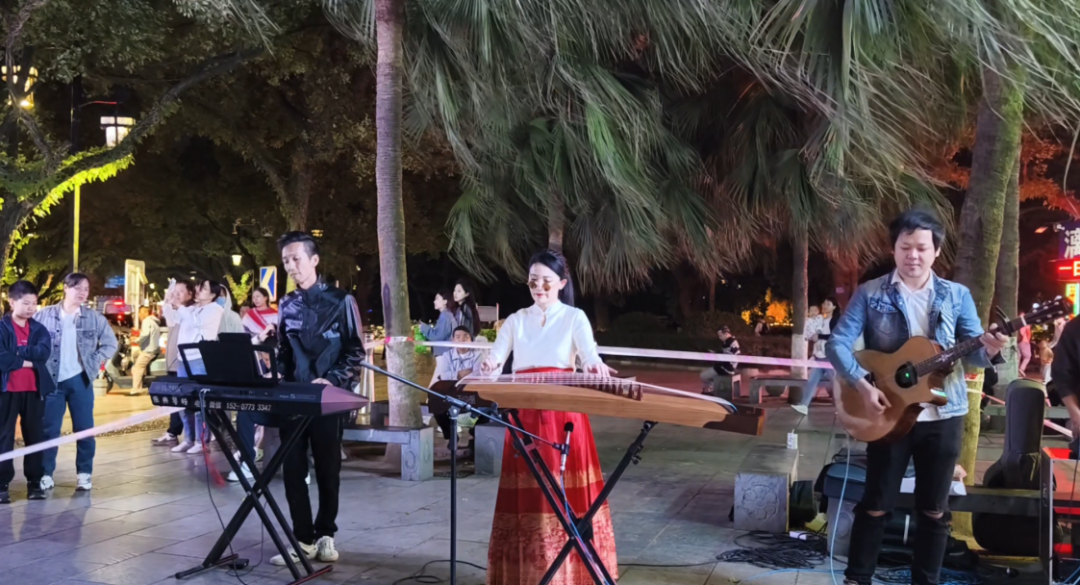 在登船码头,一边是复古的独轮车的卖货郎,推车上挂着琳琅满目的非遗鱼灯;一边是民乐摇滚演出,将传统古筝与现代电吉他、键盘相结合,为游客带来独特的文化体验。