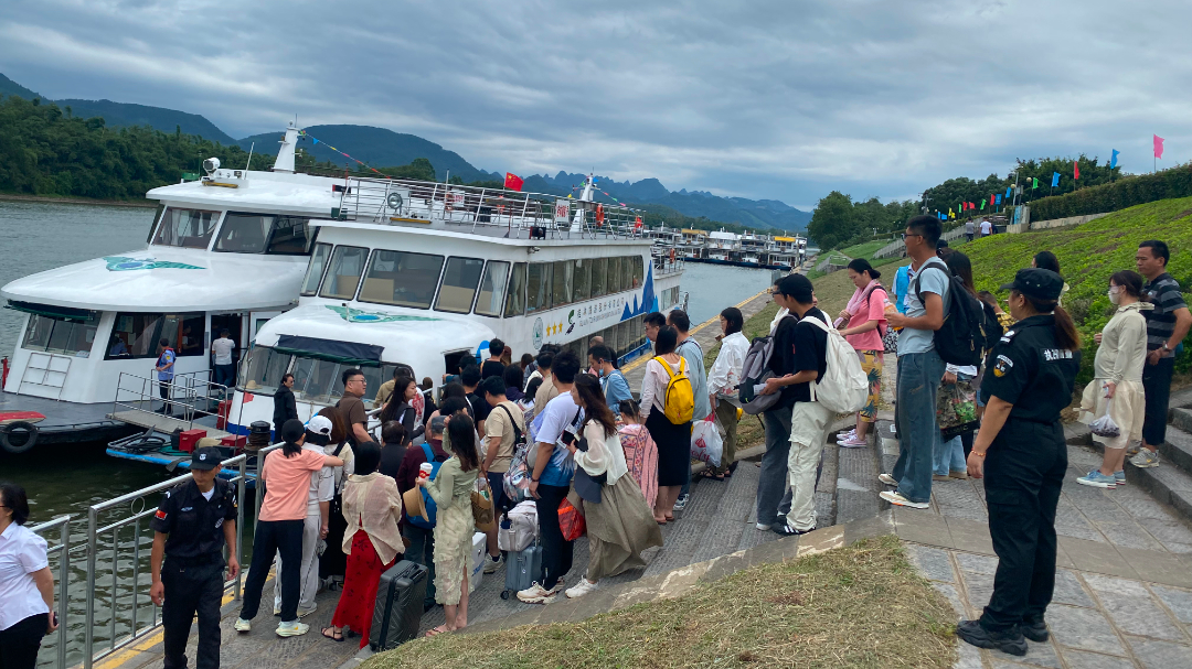 国庆节期间,漓江景区的旅游如火如荼,游客络绎不绝。漓江游船分公司通过加强节前安全检查,做好设备维修保养,全员上岗等系列措施,最大程度确保运力,争取让每一位游客都能亲身体验这片山水间的绝美画卷。