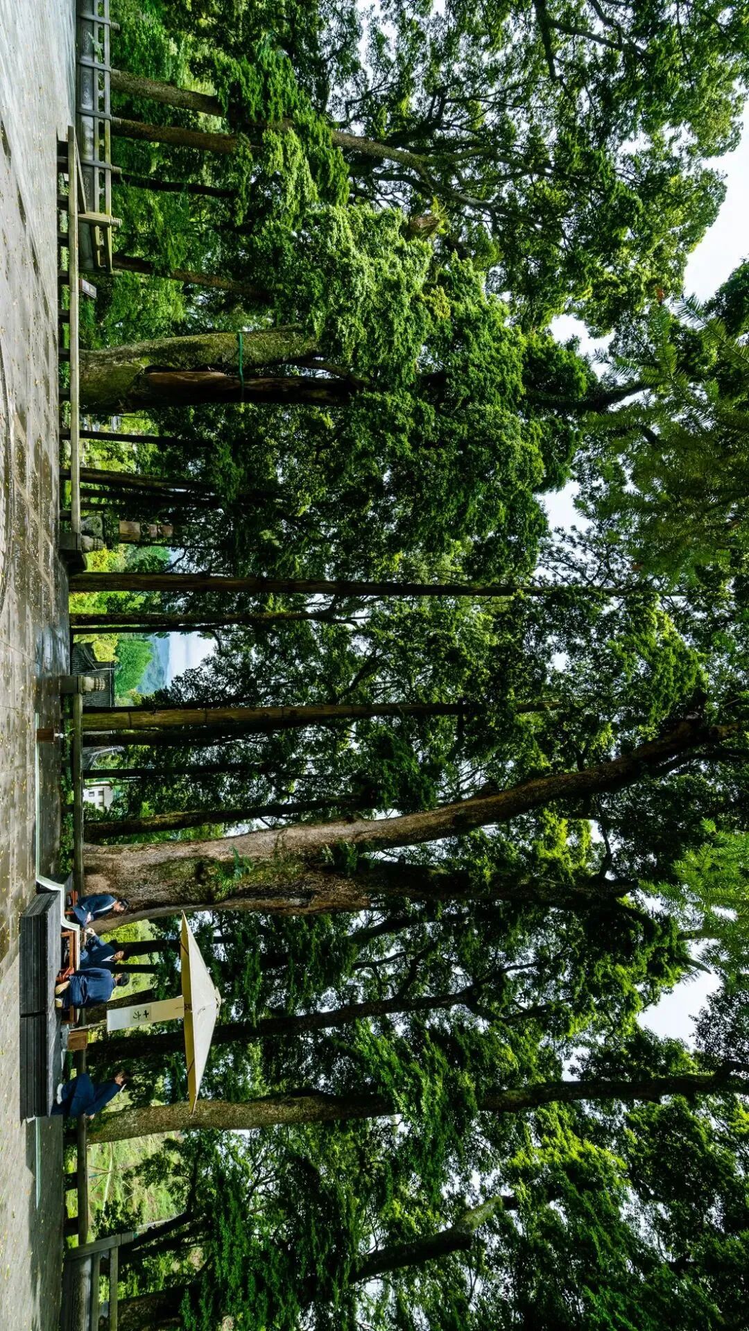 两棵桢楠古树正对寺庙大殿,位于寺庙建筑的中轴线两侧,分列山门通往大殿的石梯左右,显然不是随意生长。树王旁边,另有两棵古香杉,笔直挺立,犹如两炷高香敬献于佛殿之前。显然,这四棵古树,虽不同年代,但都必然和身后的建筑有密切关系。古人有在庭院、庙堂等建筑的门前种树的传统和风俗,既可强调建筑的神圣与庄严氛围,又可增添建筑的美感。