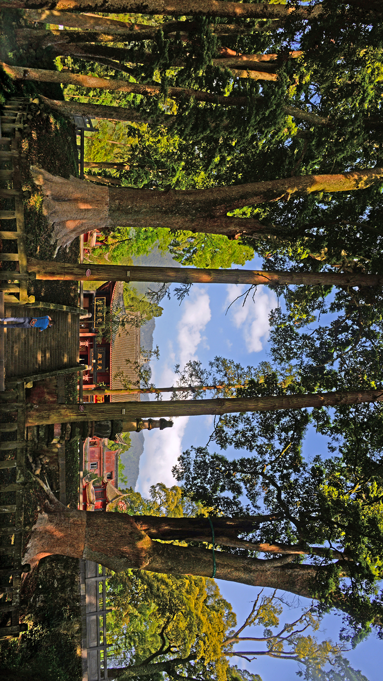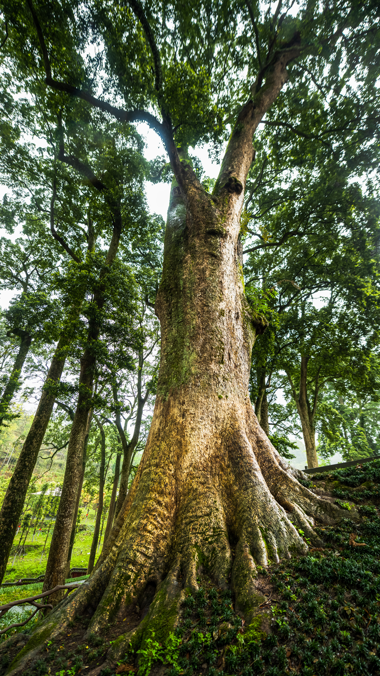 庭中有奇树,绿叶发华滋。云峰寺的层层殿宇沿着山势起伏、错落有致,周围被层层叠叠的高树环抱起来,气象萧森。两株桢楠正位于山门内天王殿前的庭院正中,巨冠凌空,如擎天之柱,树根盘错,如群龙虬结,经历风雨侵袭,岁月变迁,巨木岿然不动。摄影 / 朱含雄