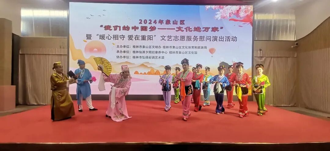 2024 年10 月 15 日,重阳节之际,象山区文艺志愿者一行十余人来到桂林仙源夕阳红康养中心开展2024年象山区“我们的中国梦一一文化进万家”暨“暖心相守 爱在重阳”文艺志愿服务慰问演出活动,为老人们送上了一场精彩纷呈的慰问演出。