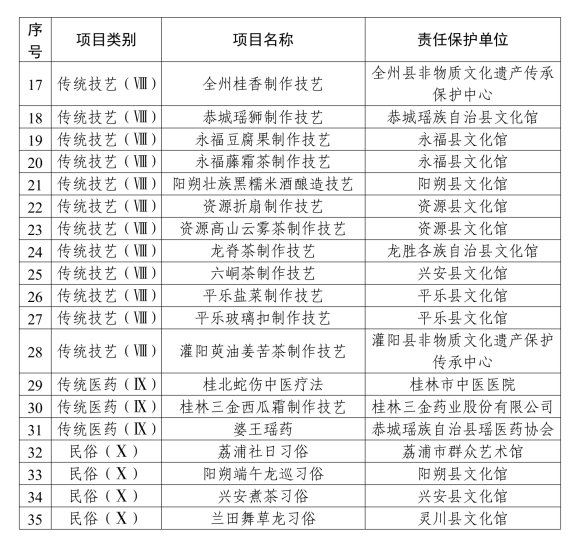 为贯彻落实《中华人民共和国非物质文化遗产法》《广西壮族自治区非物质文化遗产保护条例》和《桂林市人民政府关于加强我市非物质文化遗产保护工作的意见》(市政〔2006〕3号)精神,经专家评审和社会公示,同意将“桂林戏法”等35个项目列入桂林市第八批市级非物质文化遗产代表性项目名录,现予以公布。