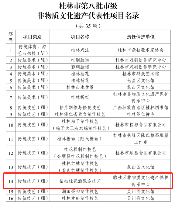 恭喜临桂桂花酒酿造技艺入选桂林市第八批市级非物质文化遗产代表性项目名录!
