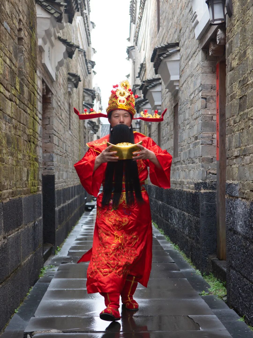 飘哥的日常里还有许多“有趣”的活儿。逢年过节,他会早早地点燃鞭炮,惊醒整个村子。庙外的广场上,有时能看到他情不自禁地“癫”一下,各种彩调小曲信手拈来;长桌宴上,他又成了“财神爷”,手握金元宝,穿梭人群中,为每一桌人送上祝福和笑声。