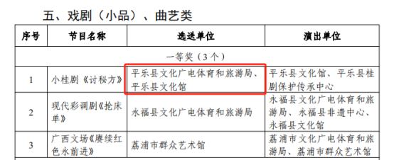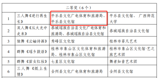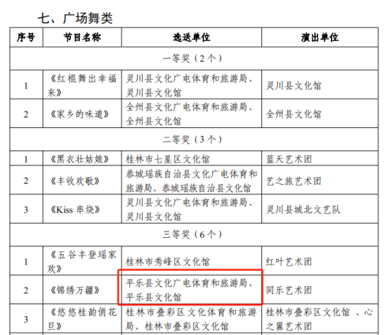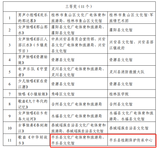 2024年11月15日,中共桂林市委员会宣传部、桂林市文化广电和旅游局关于公布桂林市第45届“漓江之声”群众文艺活动获奖名单的通知,平乐县文化广电体育和旅游局获优秀组织奖、戏剧(小品)、曲艺类节目一等奖、舞蹈类节目二等奖、音乐类节目三等奖、少儿才艺类节目三等奖、广场舞类三等奖。
