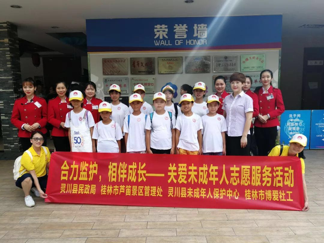 伴随着时间匆匆的脚步,暑假已经悄悄走过一半。在这假日里,有太多的孩子在父母的陪同下游山玩水,享受着快乐而自由的时光;而有那么一群人——留守儿童,却只能在对父母的思念与等待中度过。更有甚者,有些孤儿只能成天对着家里的天花板发呆。考虑到这样的社会情况, 在2018年8月20日上午,芦笛景区携手灵川县民政局和灵川县未成年人保护中心开展“合力监护,相伴成长”志愿服务活动。让这一群留守儿童能够在炎炎夏日里走进清清凉凉的芦笛岩中:一览大自然艺术之宫的魅力;同时探索岩洞形成的秘密。