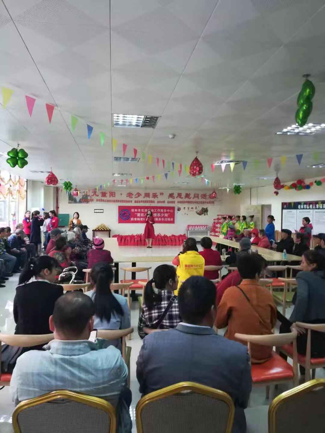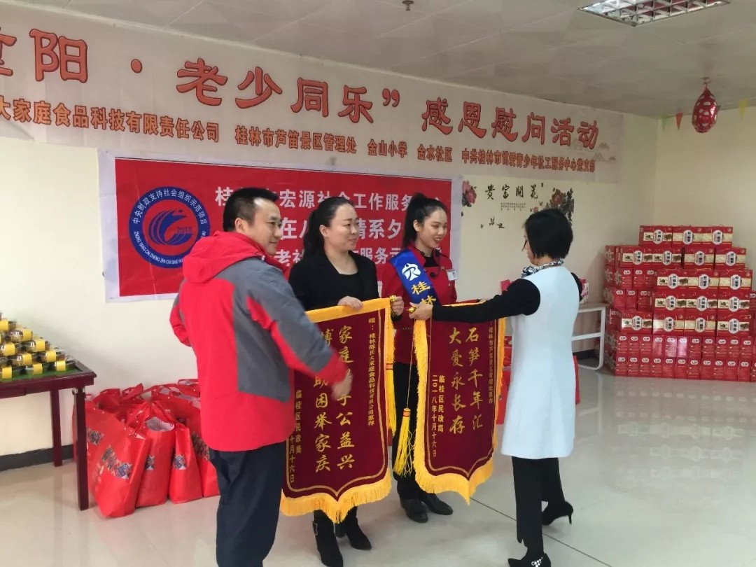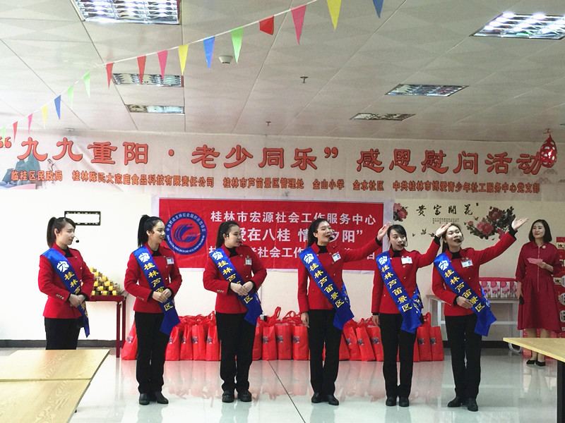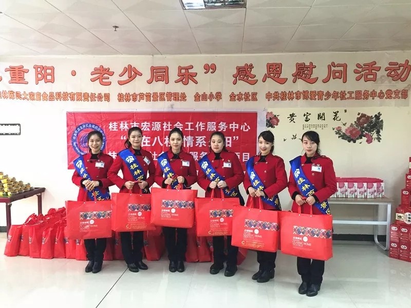 2018年10月16日上午,重阳节来临之际,为表达对老年人的关心和关爱,芦笛景区携手中共桂林博爱青少年社工服务中心、大家庭实业、金水小学、金水社区,来到位于临桂区的幸福家园养老中心,开展“九九重阳,老少同乐”为主题的慰问活动。除了送上生活必需品外,还给他们带去了丰富多彩的文艺表演,为他们送去祝福和温暖。