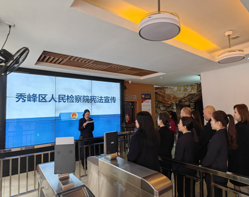 桂林市秀峰区人民检察院的检察官向景区员工、市民、游客宣传普及了《中华人民共和国旅游法》、《桂林市漓江风景名胜区管理条例》、《桂林市石刻保护条例》、《桂林市喀斯特景观资源可持续利用条例》等行业法律法规,发放了宣传资料,积极引导他们参与到宪法等相关法律的推广和普及中来,加强宪法的学习,形成守法自觉。