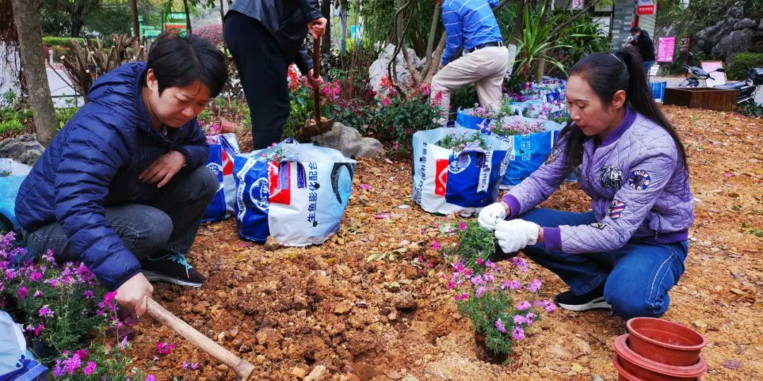 在花圃内,景区三十多名员工热情高涨,花了一上午的时间,栽种下了红枫、美女樱、美人梅等树苗和花苗。种好的花苗和树苗生机勃勃,“花海”里,花朵争奇斗艳,每朵花都是一笔细腻的描摹,浓郁的花香让人心旷神怡,一派春回大地的景象。