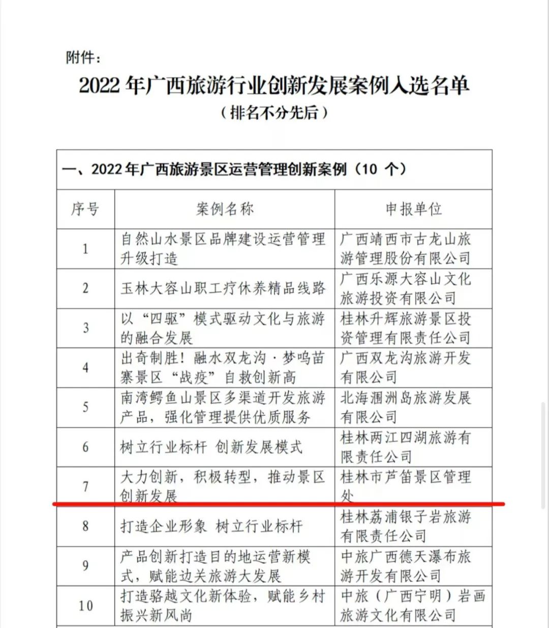 2022年,面对疫情的影响,芦笛景区全体员工团结协作、攻坚克难、开拓创新、真抓实干,以打造国宾品质景区为抓手,转型升级旅游产品,坚持打造国宾服务品牌,坚决维护旅游市场经营秩序,全面构建和谐平安景区,取得显著成果。