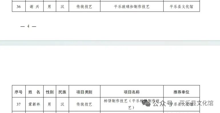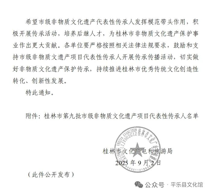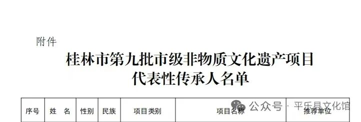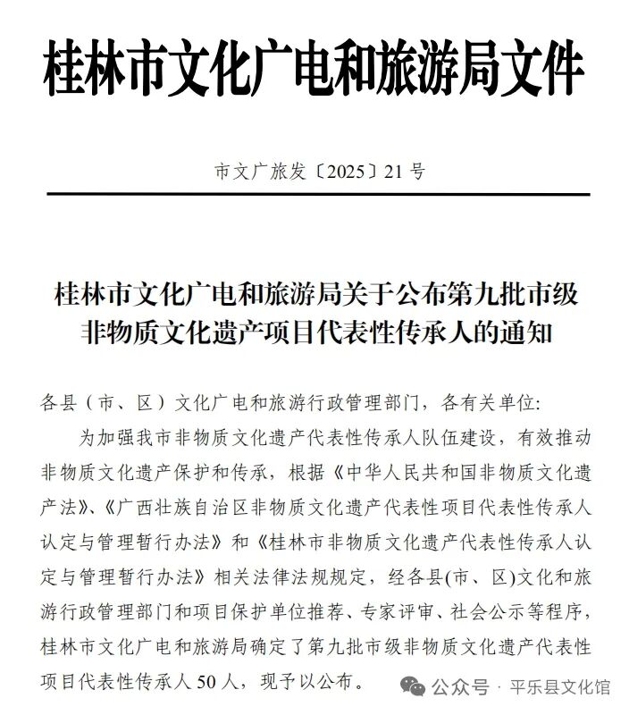 桂林市文化广电和旅游局为加强我市非物质文化遗产代表性传承人队伍建设,有效推动非物质文化遗产保护和传承,根据《中华人民共和国非物质文化遗产法》、《广西壮族自治区非物质文化遗产代表性项目代表性传承人认定与管理暂行办法》和《桂林市非物质文化遗产代表性传承人认定与管理暂行办法》相关法律法规规定,平乐县文化馆立即行动对符合申报条件的人员进行摸排,最终推荐平乐玻璃扣制作技艺,平乐柿饼制作技艺的两位传承人进行申报。经专家评审、社会公示等程序,公布我县第九批市级非物质文化遗产代表性项目代表性传承人2人。