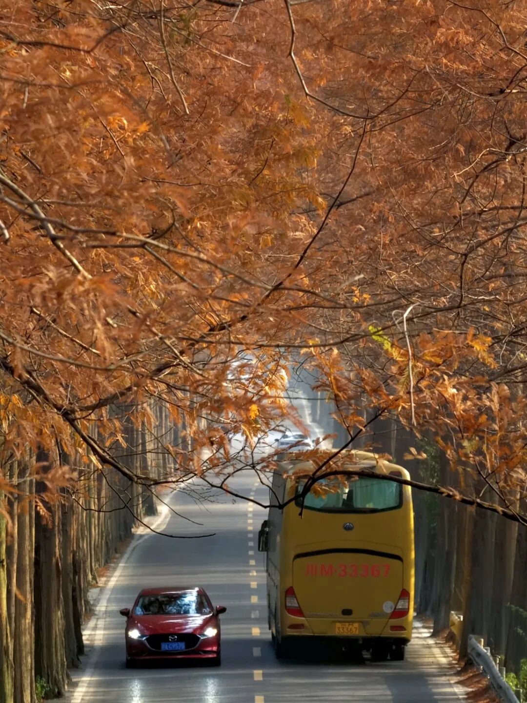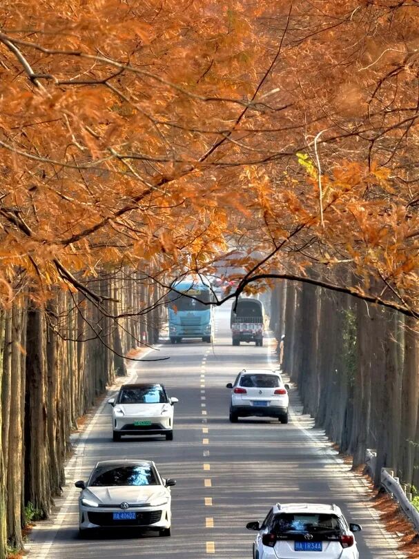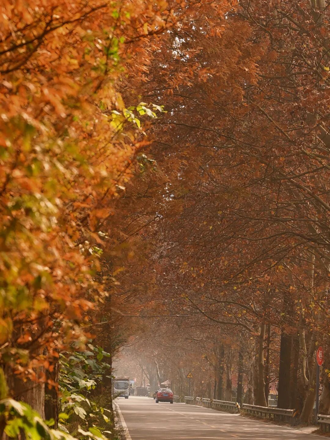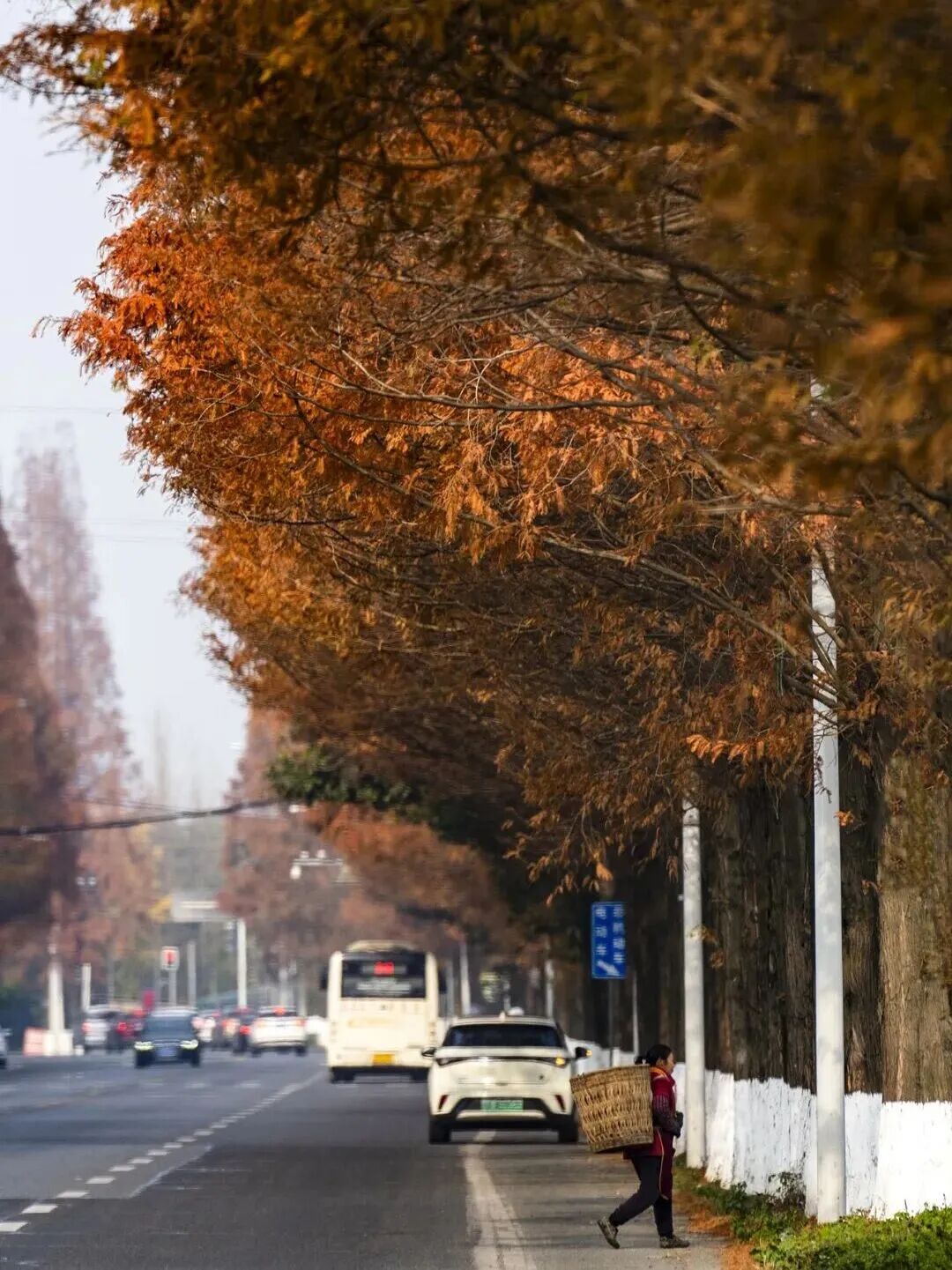 道路两旁的水杉褪去翠绿,换上焦糖色的盛装,阳光透过枝叶洒下,在路面铺就斑驳的光影,仿佛穿越进复古电影里的场景。