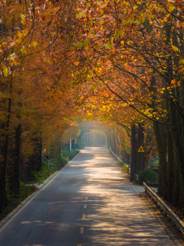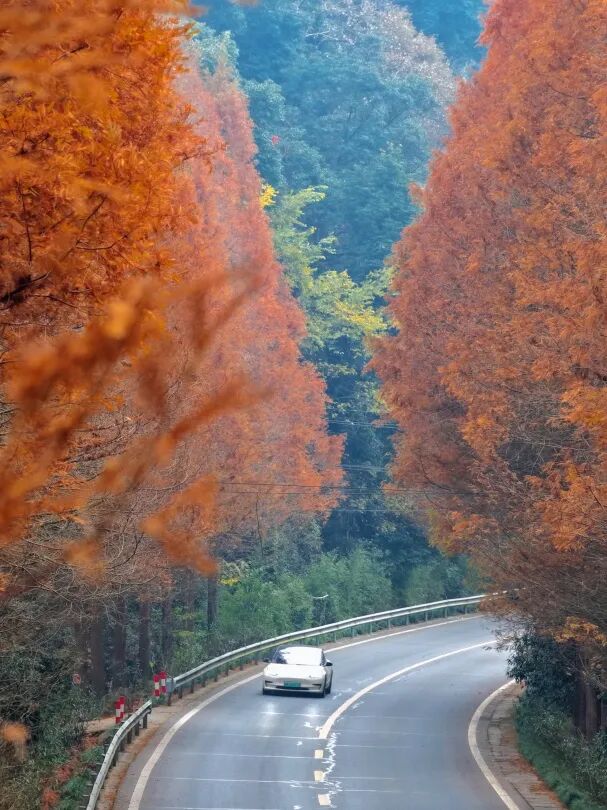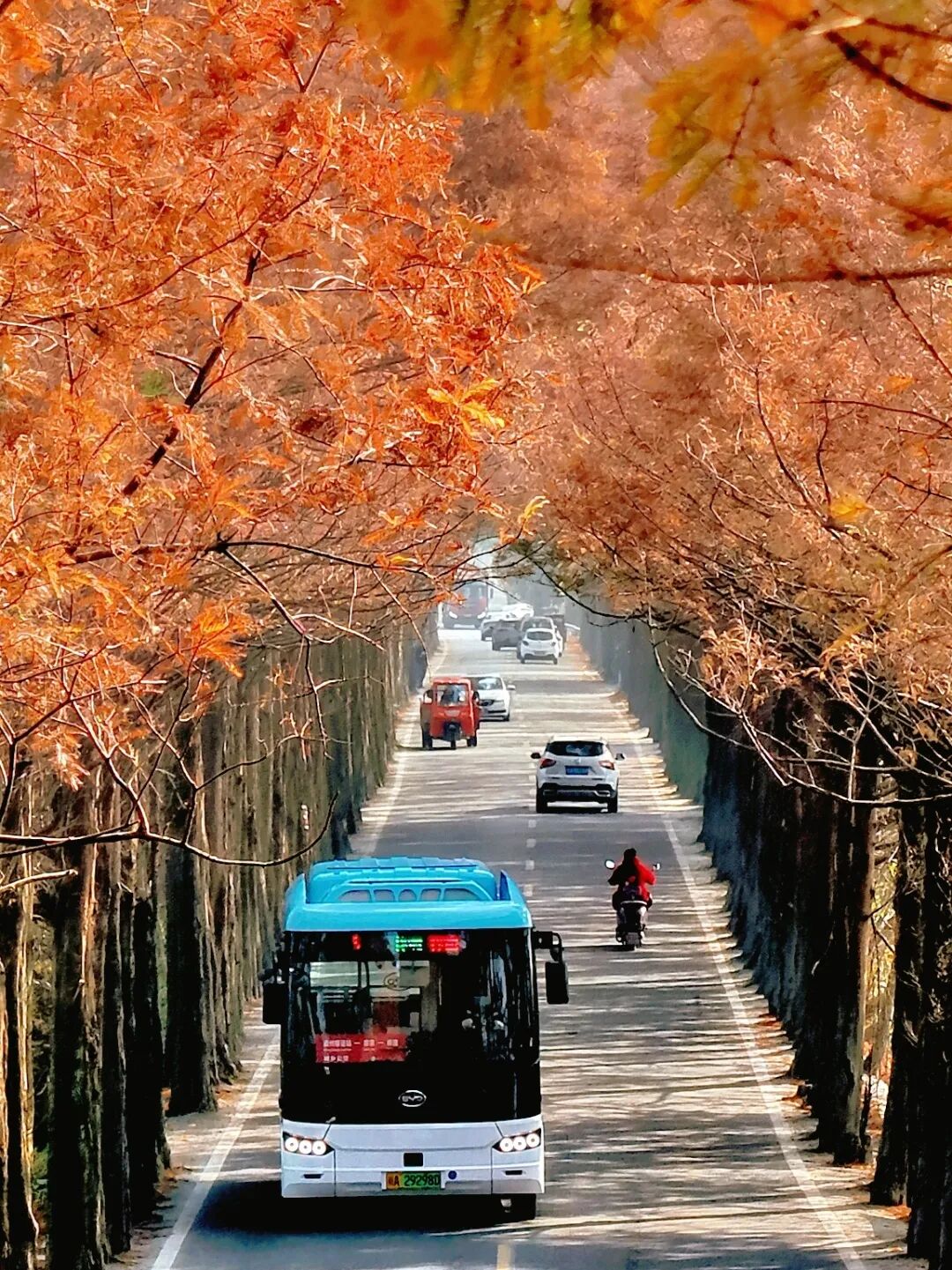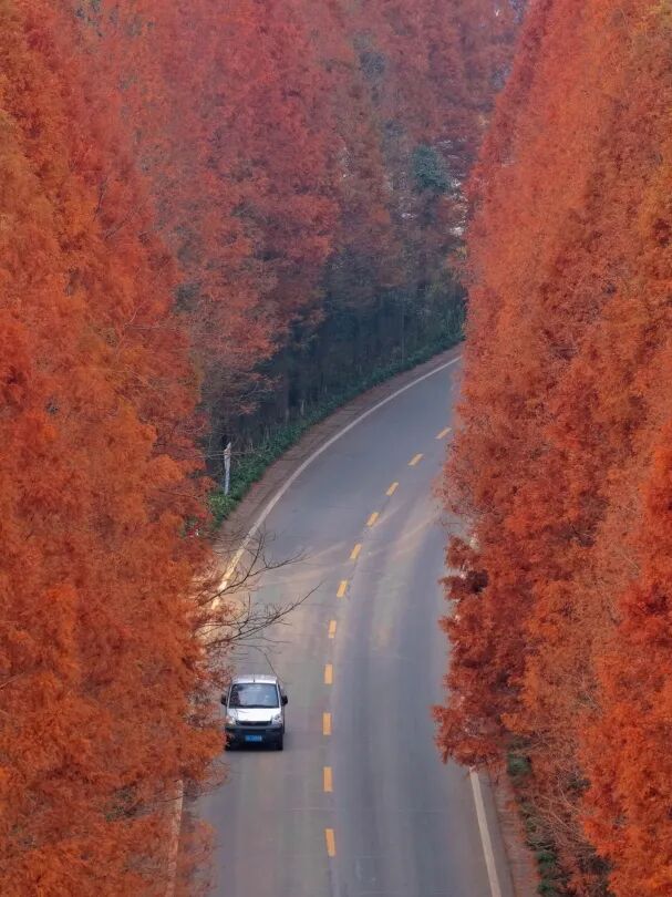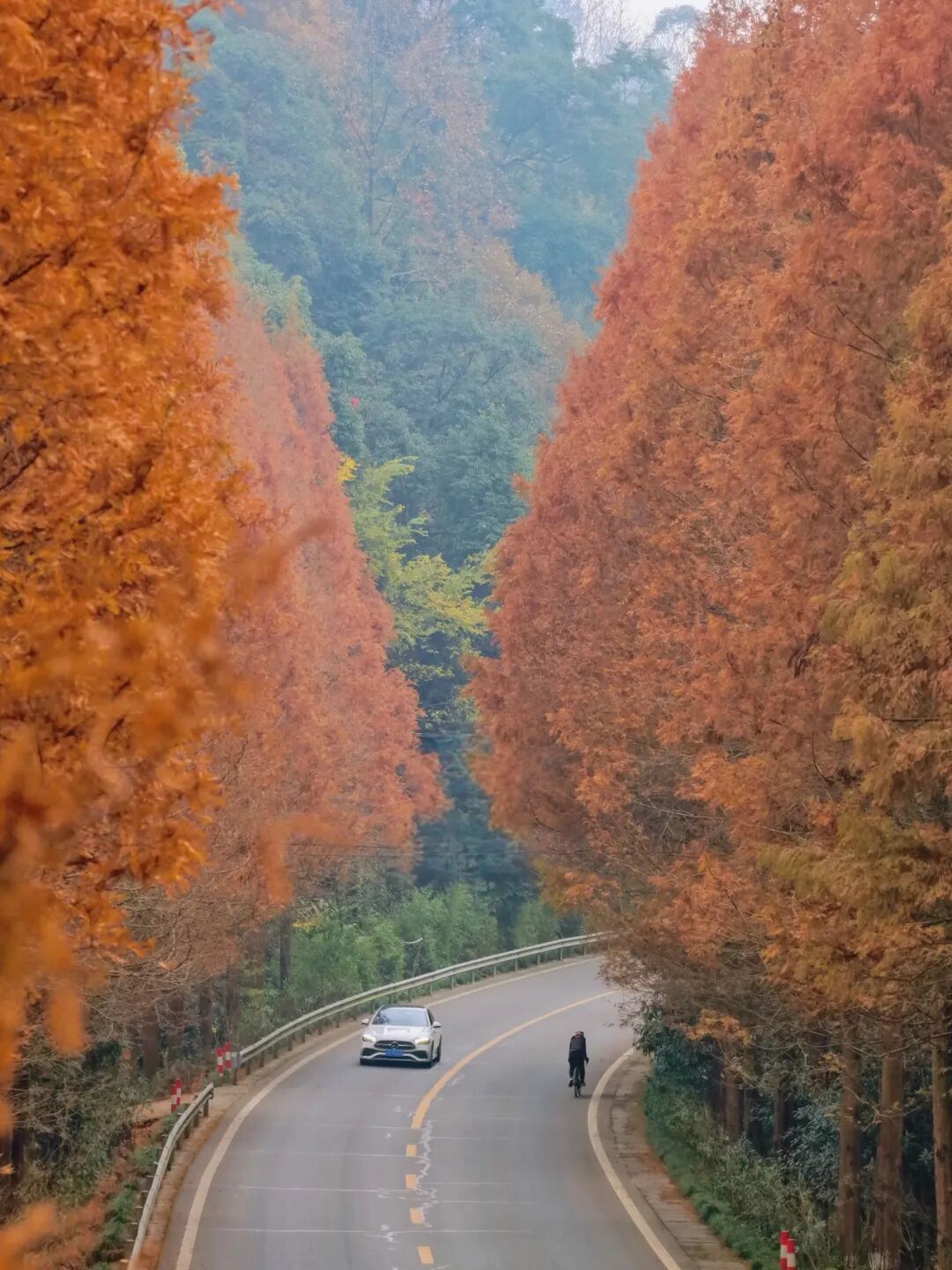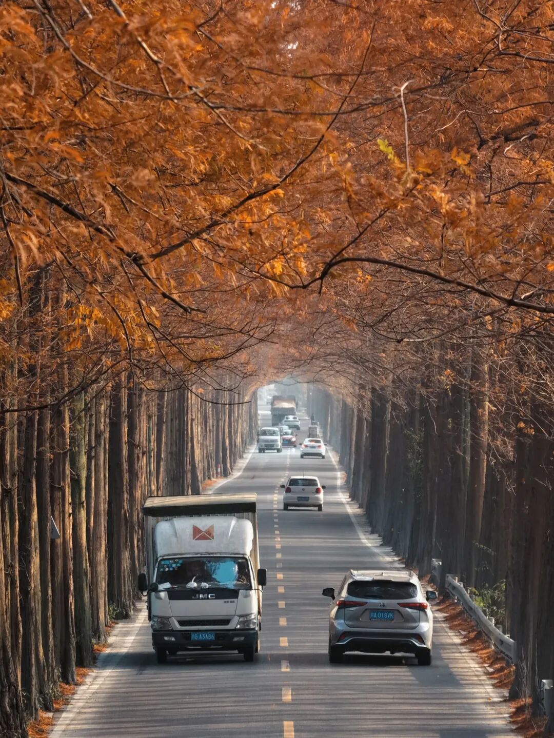 道路两旁的水杉褪去翠绿,换上焦糖色的盛装,阳光透过枝叶洒下,在路面铺就斑驳的光影,仿佛穿越进复古电影里的场景。