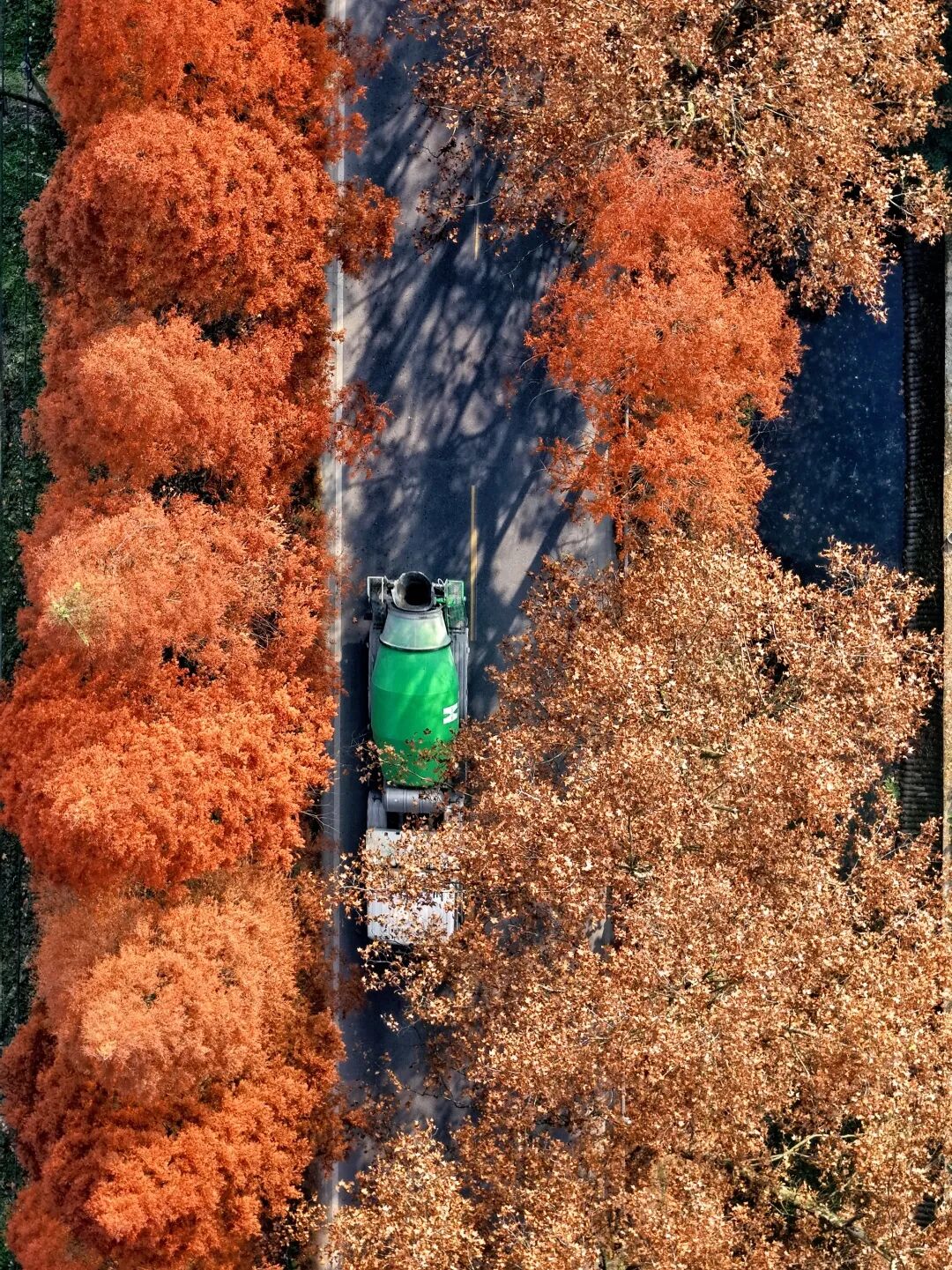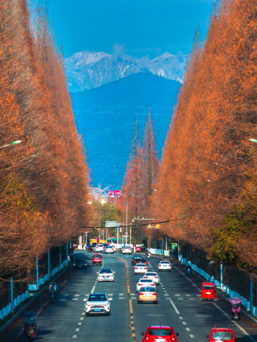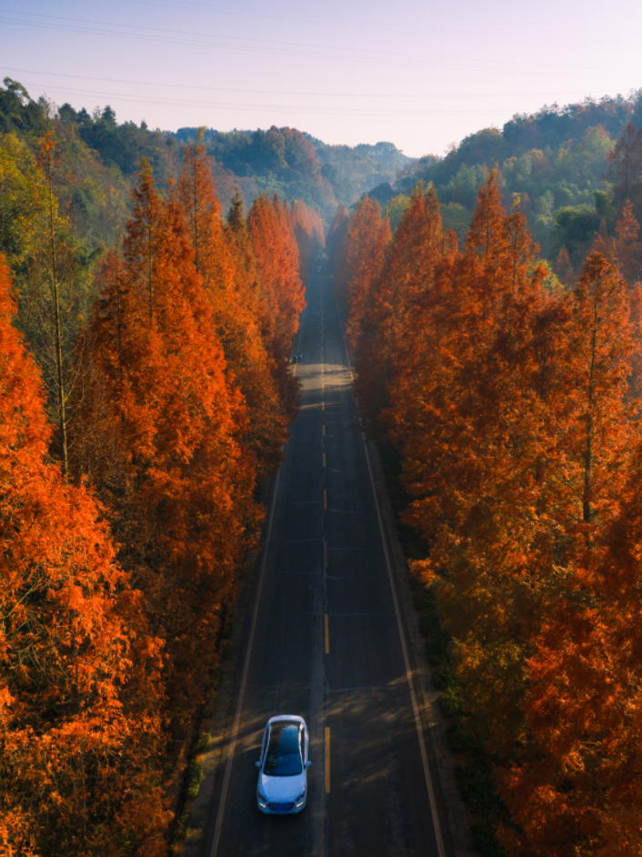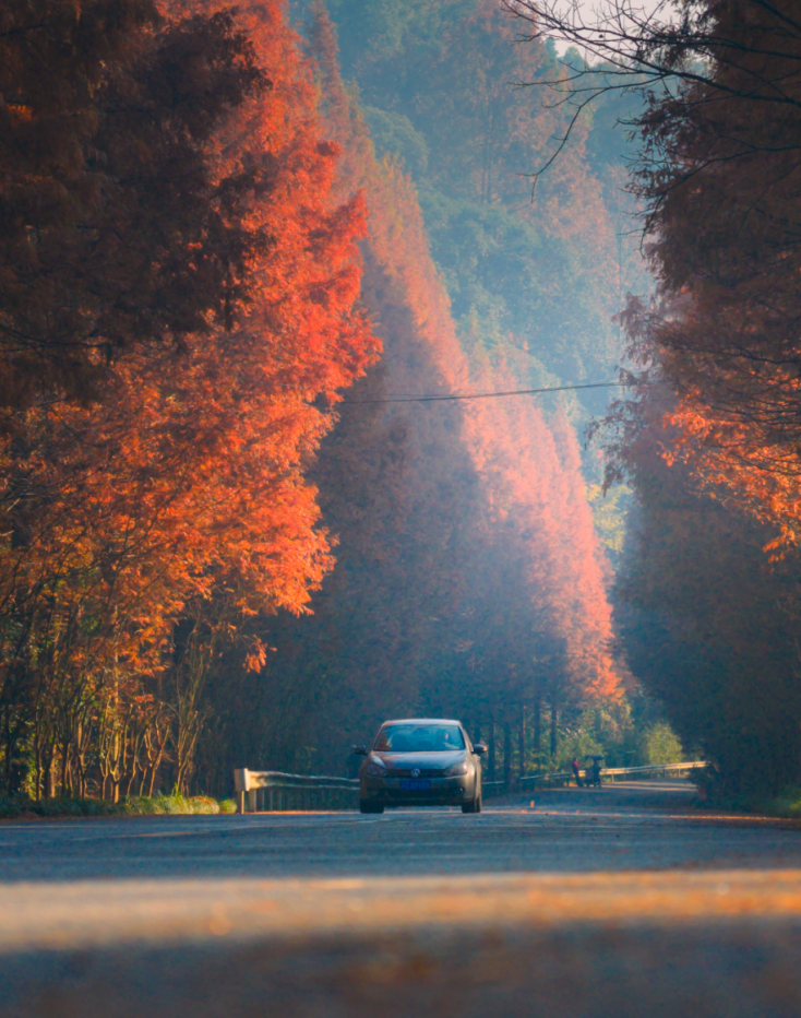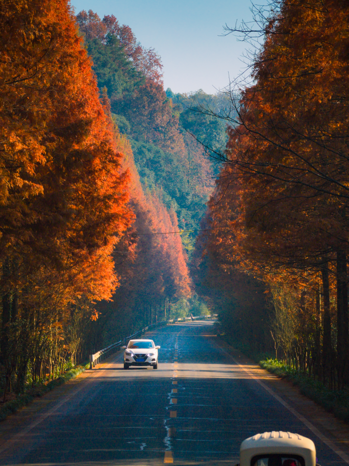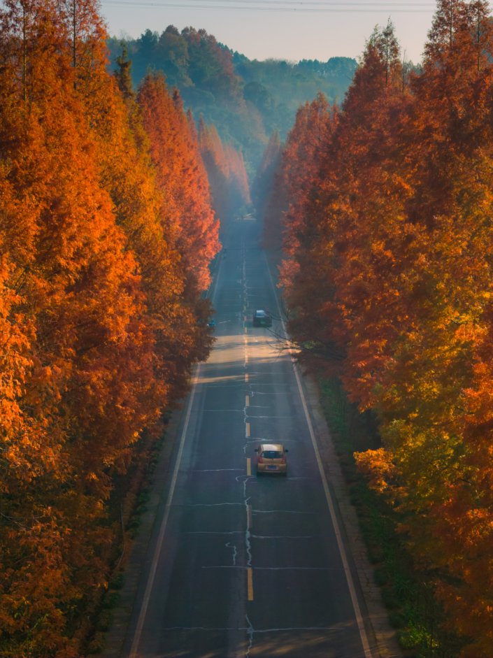 道路两旁的水杉褪去翠绿,换上焦糖色的盛装,阳光透过枝叶洒下,在路面铺就斑驳的光影,仿佛穿越进复古电影里的场景。