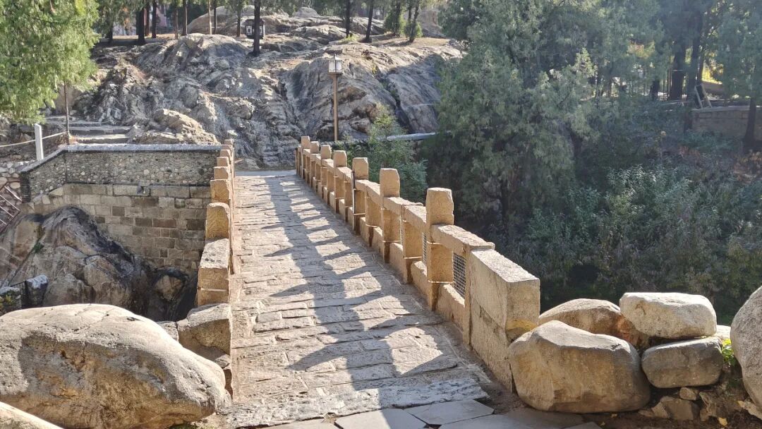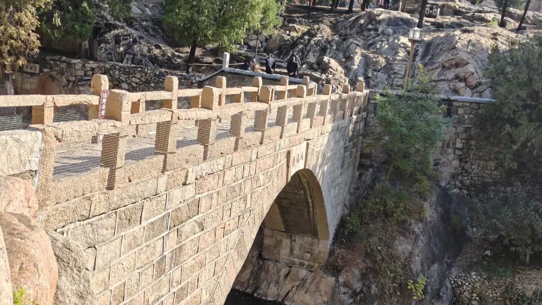 在泰山王母池东侧的梳洗河上,架有一座单拱石桥,桥长18.05米,宽2.16米,拱跨度为9米,桥面条石平铺,两侧为方石柱栏杆, 如卫士般守护着往来行人。拱额刻有“八仙桥”三字,落款为民国三十二年,历经风雨依然清晰。此桥虽小,却承载着一段厚重的历史故事。