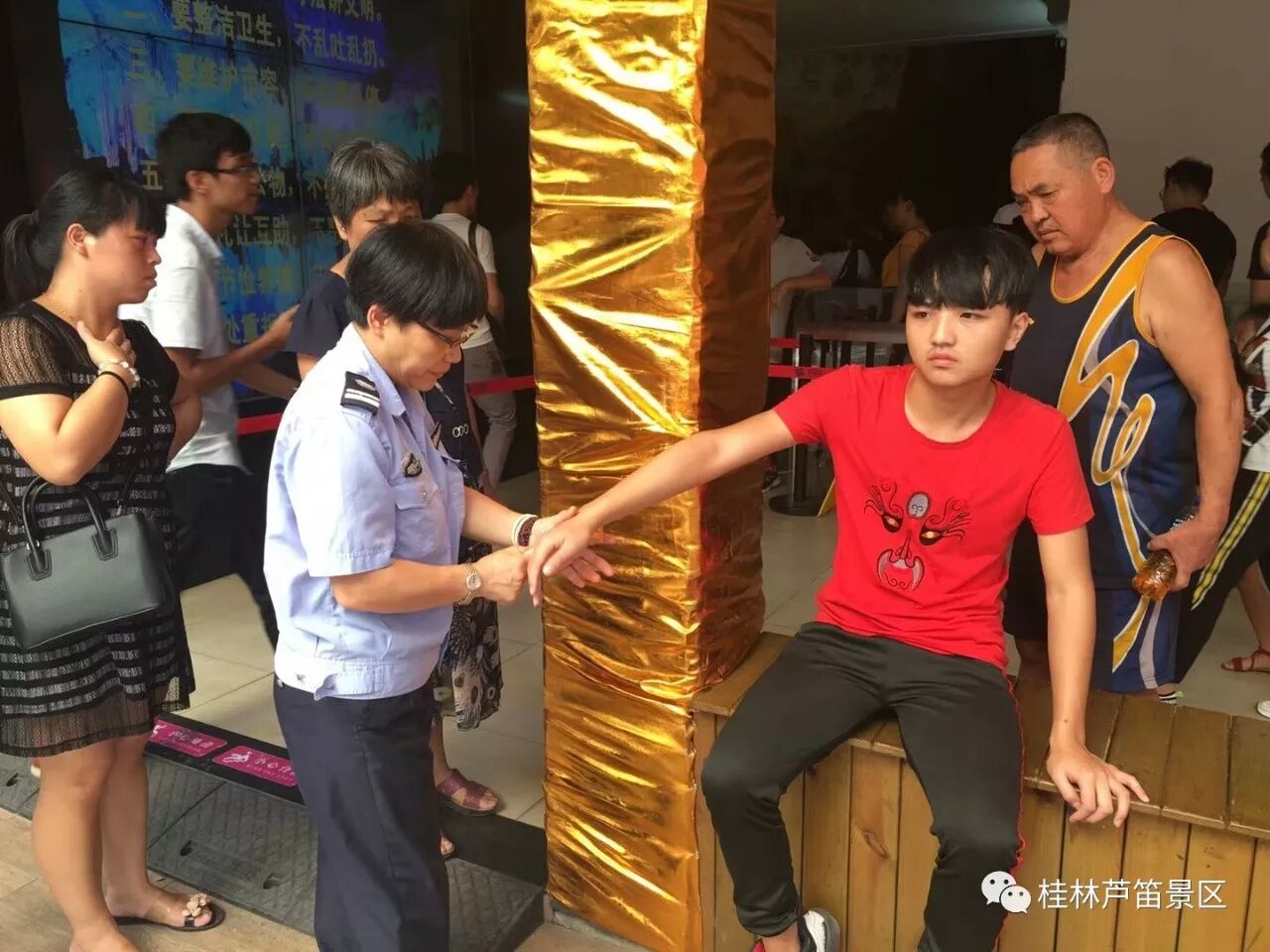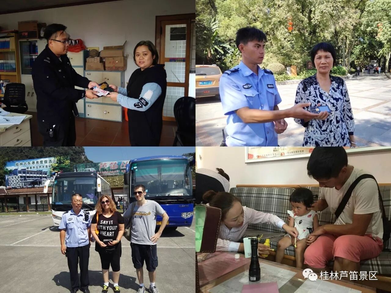 在芦笛景区这样的好人好事每天都在上演: 2017年2月2日下午,景区停车场值班的保安员发现一名约5岁的小男孩正在哭泣,保安员立刻上前进行了安抚和耐心的询问,经了解他是广州人与一同来景区游玩的爸爸走散了,并在聊天中询问了该名男孩父亲的外形和衣帽特征后,保安员立刻通过对讲机将详细情况汇报给景区保卫部门,保卫部反映迅速安排保安员全员出动锁定景区周边范围,经过30多分钟的查找,终于帮助该名男孩找到了父亲。