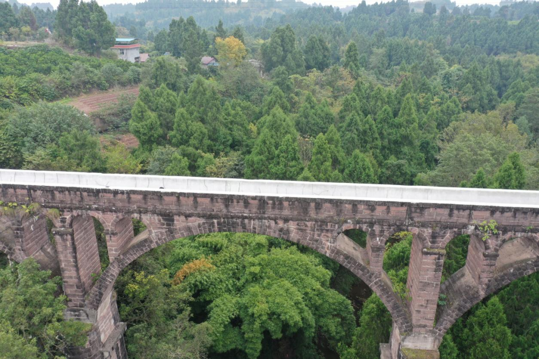 雁江区清水乡大天桥,位于雁江区宝台镇滴水村和南津镇擦耳村交界处,是雁江区现存规模最大、保存最为完整的一段渠道,是一座具有历史意义的近现代代表性建筑,在上个世纪六七十年代全国大兴水利设施、巩固农业基础、保障农业生产的背景下修建。该桥建在上心桥和跳墩河之间,北面为宝台镇滴水村,南面为南津镇擦耳村,是鲤鱼水库枢纽工程的配套工程,全长173米,通高42米,结构独特,渡槽、桥墩和桥体均采用就近取石材构建,钢架拱则由当时县水电局焊接完成。桥北面刻有“治山治水功效宏 群策群力智慧广”,水源从鲤鱼水库抽入,可供南津镇刘家村、新店村、斜石村、擦耳村和竹林村,以及宝台镇河堰村、滴水村、铁锁村和卓家村2万亩农田的灌溉,有效推动了当地粮食增产和农业经济发展。2024年5月,清水乡大天桥被资阳市人民政府公布为资阳市历史建筑,2025年5月,被资阳市人民政府公布为资阳市第四批市级文物保护单位,进一步肯定了其珍贵的历史价值。此次入选省级革命文物名录为我区革命文化资源增添了宝贵的历史坐标,进一步丰富了我市革命文化底蕴与传播素材。