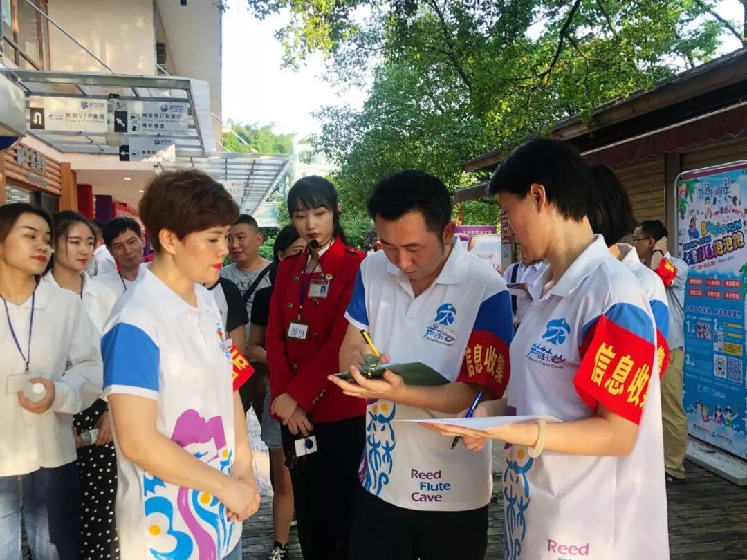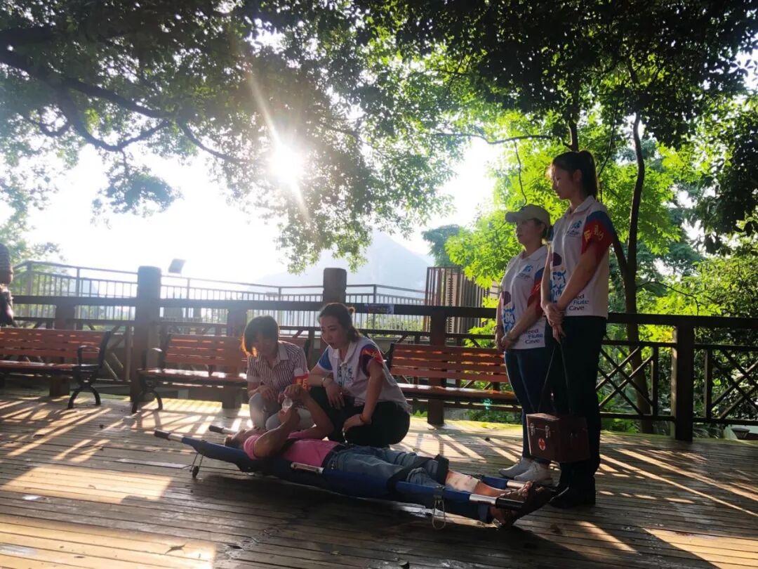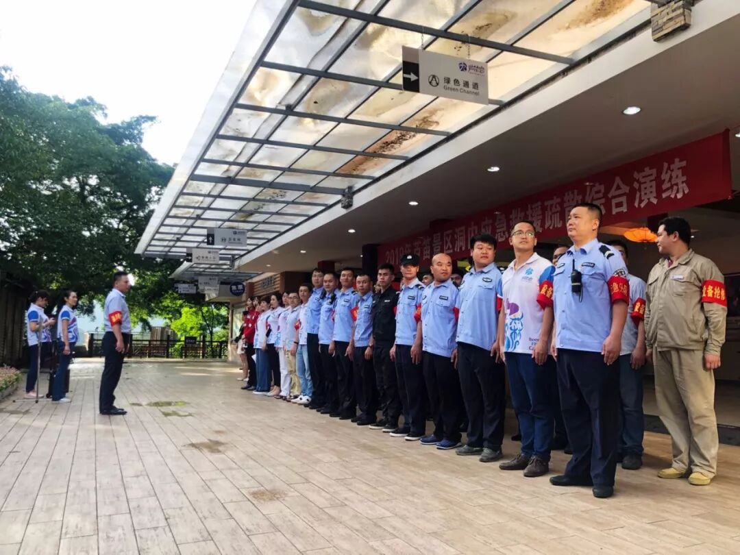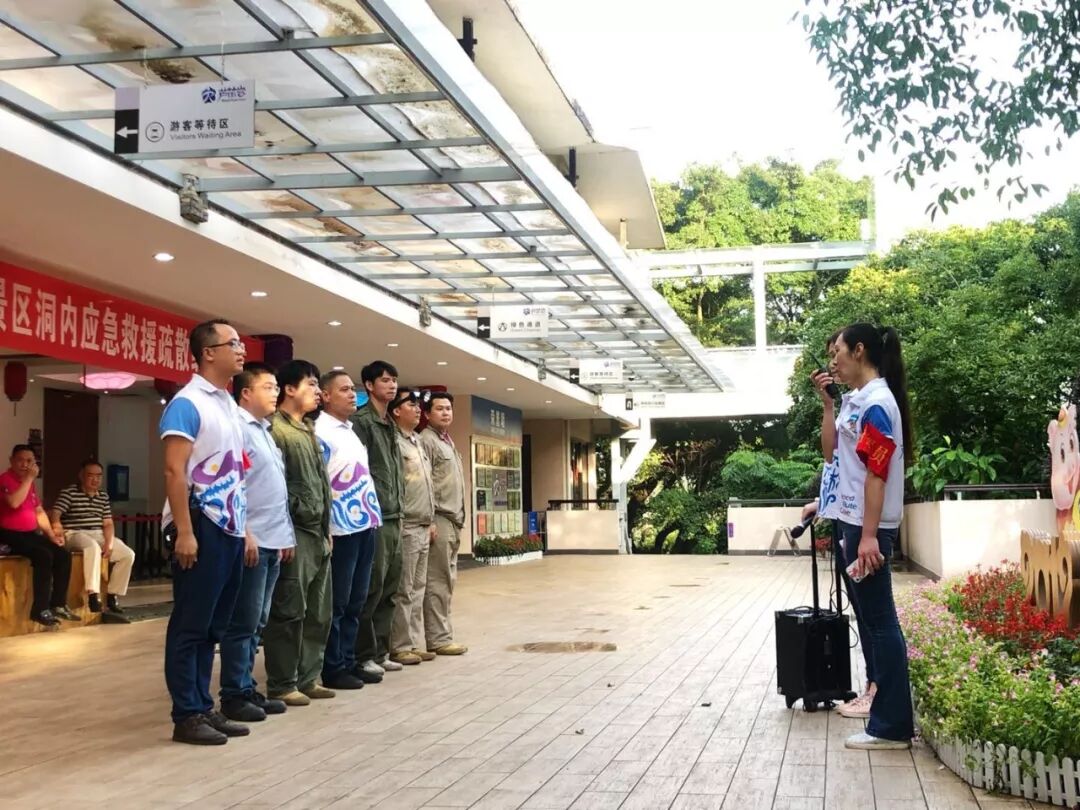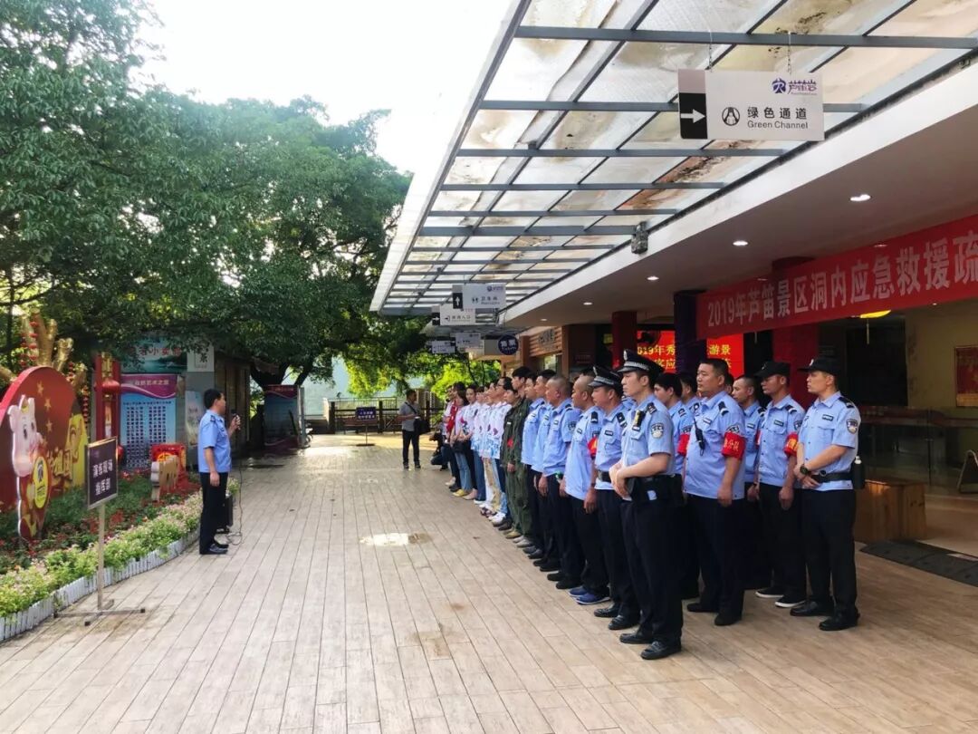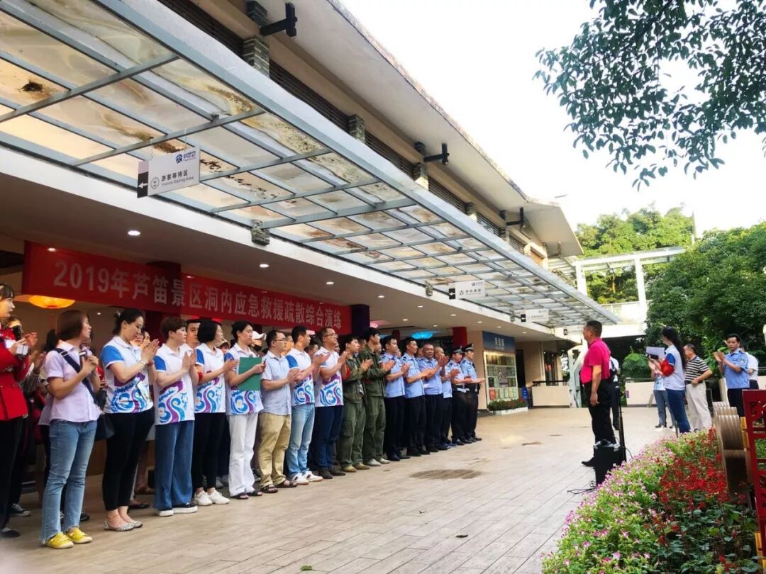 2019年6月18日芦笛景区开展了洞内游客疏散救护综合演练,本次预演以预设景区洞内供电系统出现故障,芦笛景区洞内全部断电,造成洞内所有照明设备无法使用,有两批游客滞留在岩洞内,其中一名游客受伤,一名游客失散展开。