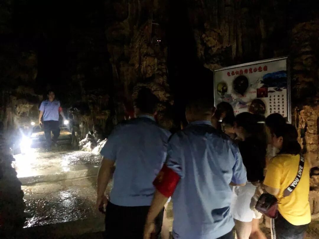 各小组赶赴现场,现场总指挥下达任务,疏散搜救组进洞疏散被困人员将被困人员疏散至“集合地点”;救护组向120、110报告求助并进洞救治伤员,将伤员运送至“医疗救治区”等待120到场;安全项目部控制现场,善后耐心安抚游客及家属情绪。经过各小组配合工作,被困人员全部解救,转至医院救治或已妥善处置;景区电力恢复正常。