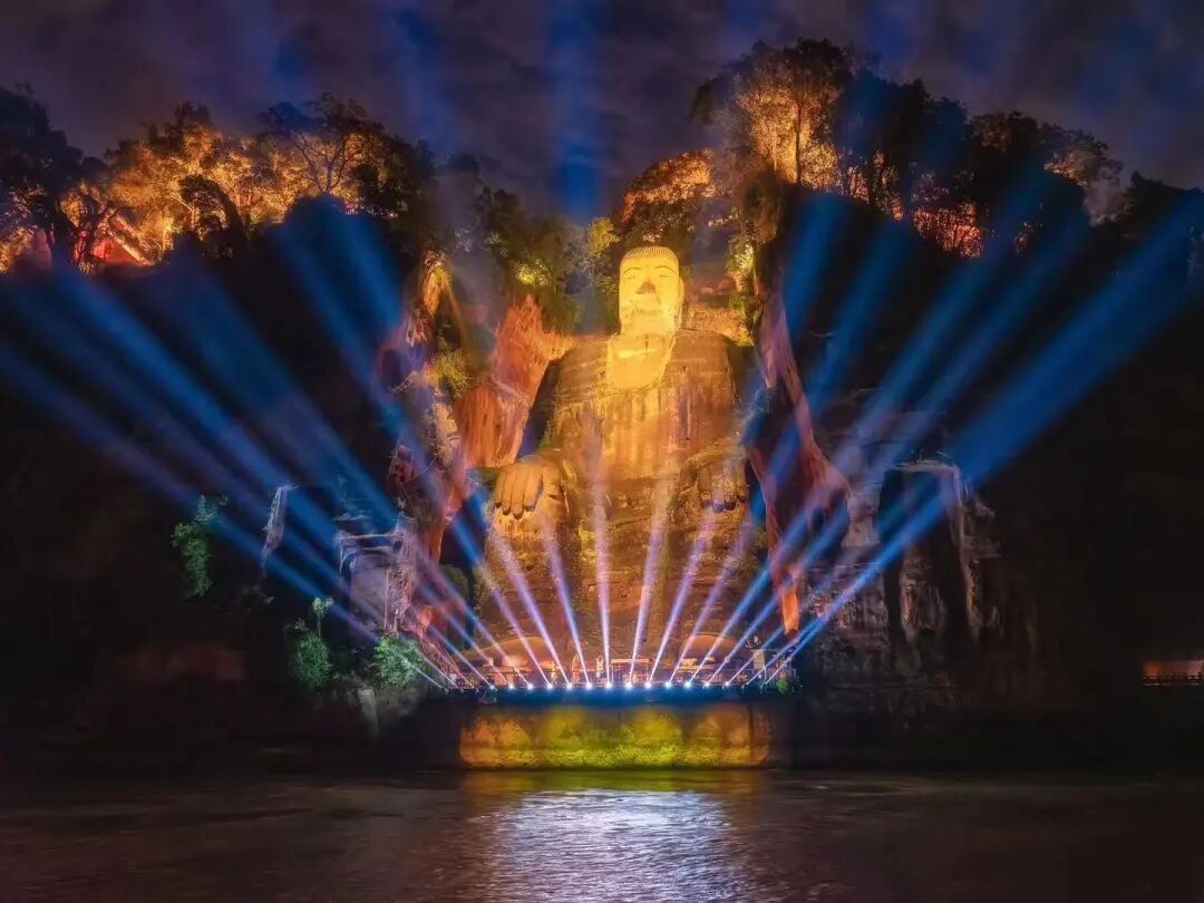 三江汇流处,大佛与古城相望,游船在大佛脚下停靠,在灯光的映衬下,佛身笼罩着金光,更加庄严肃穆。