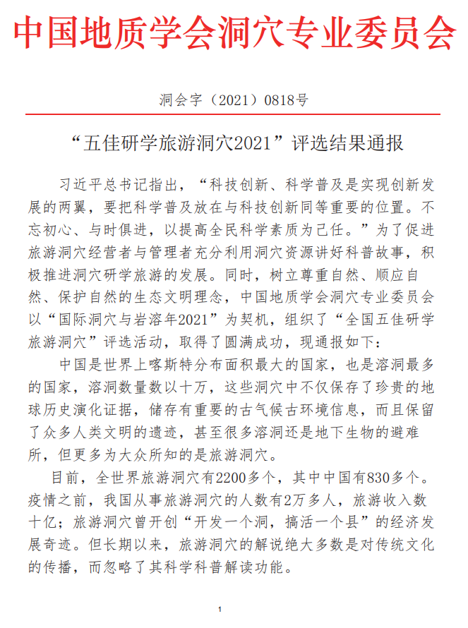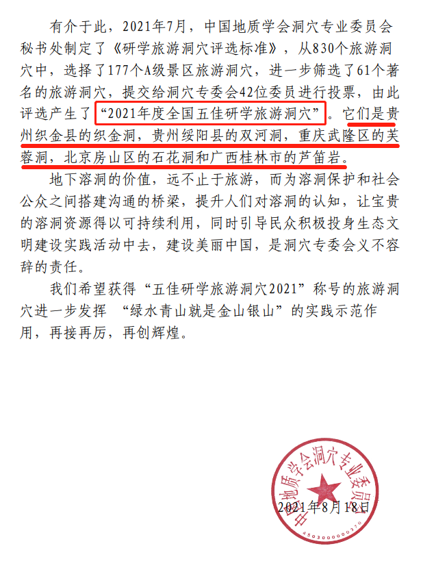 今年,中国地质学会洞穴专业委员会秘书处制定«研学旅游洞穴评选标准»,从830个旅游洞穴中,选择了177个A级景区旅游洞穴,提交给洞穴专委会委员进行投票。芦笛景区从2017年开始致力于研学产品的研发与设计,经过5年的不懈努力,芦笛景区不仅在去年获得“自治区级中小学研学实践教育基地”,同时在这次评选活动中也获得中国地质学会洞穴专业委员会全部委员一致认可,获评“2021年度全国五佳研学旅游洞穴”。作为广西唯一获此殊荣的溶洞景区,我们将进一步丰富研学游产品,以更好服务践行“笑迎天下客,满意在芦笛”。
