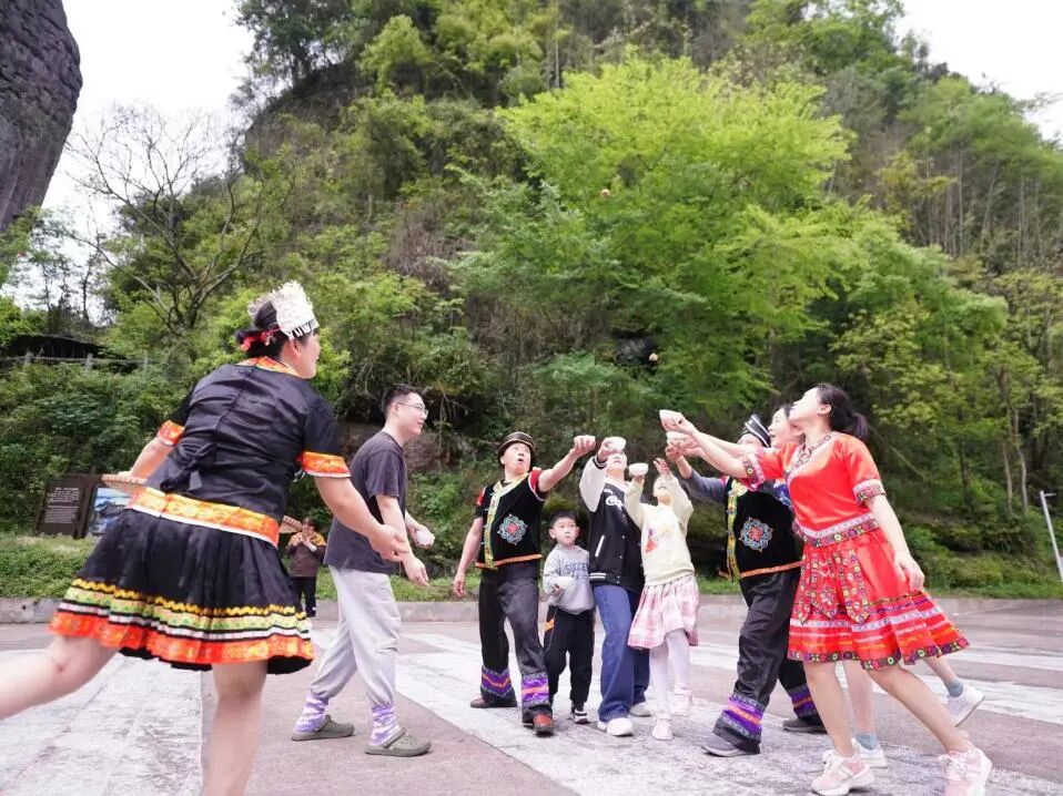 此外,景区还根据资源县当地民俗风情,推出了传统习俗“抛饭”体验,让游客朋友们能够在现场了解资源的风土人情,同时通过“抛饭”仪式,接受当地人民对客人们的美好祝愿。