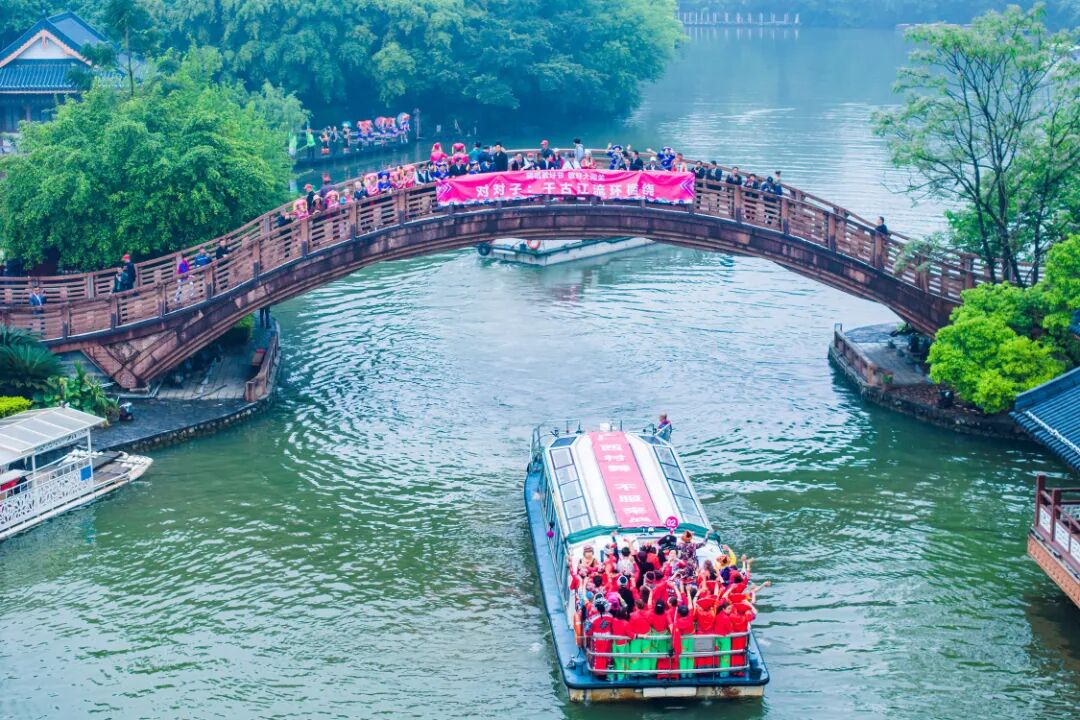 在日月湾码头,约800名游客迎来了令人期待的游船体验。“歌仙”刘三姐乘着轻舟缓缓驶出,以一首经典的《山歌好比春江水》为开场,引领18艘游船共同展开一场沉浸式实景山歌体验之旅。船队驶过阳桥时,岸上演员与游客互动,并共同呐喊“广西三月三 嗨唱歌圩节”,欢乐热烈。