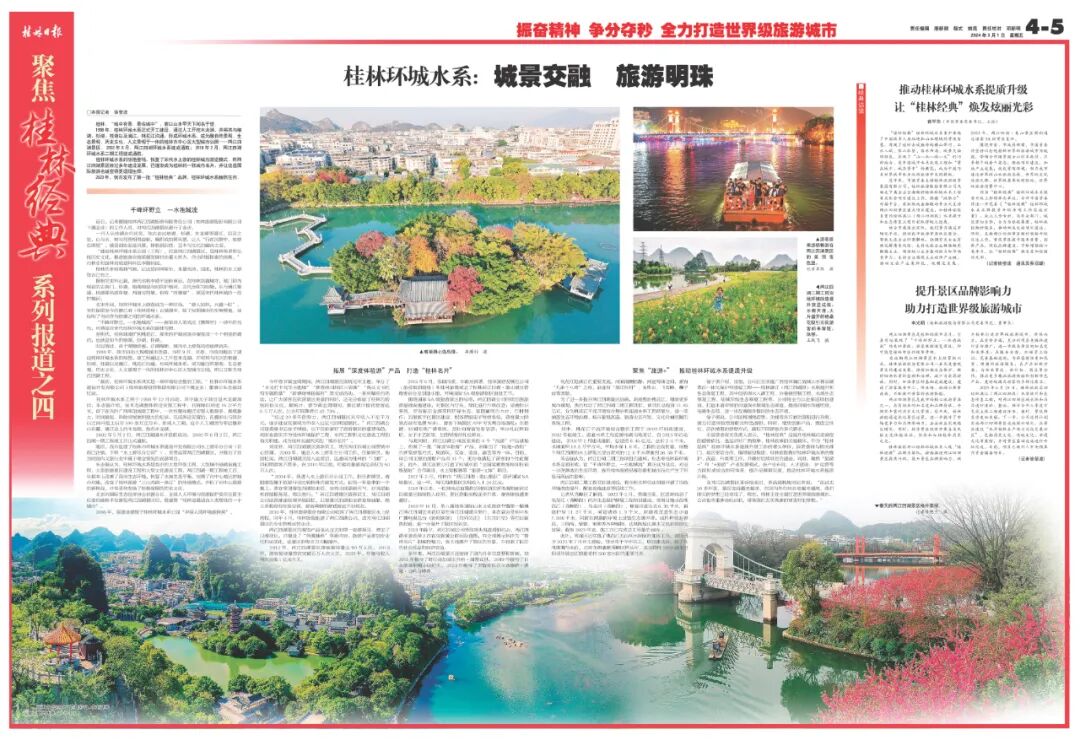 市国资委有关负责人表示,“桂林经典”是提升桂林城市美誉度的重要依托,也是讲好广西故事、桂林故事的关键载体。作为“桂林经典”桂林环城水系提质升级工作的牵头单位,国资委将与相关部门、城区密切合作,指导旅投集团、桂林旅股做好桂林环城水系的维护、改造、升级等工作,并做好后续项目的建设。同时,聚焦“旅游+”和“+旅游”产业发展模式,在产业布局、人才建设、IP运营等方面形成综合协同体系,提升品牌辨识度,推动桂林环城水系提质升级。