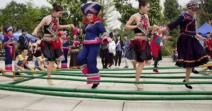 众人齐跳竹竿舞,壮族风情美如画;竹竿敲响欢乐声,三姐跳跃送祝福。用富有壮家特色的竹竿舞为前来游览的客人献上诚挚的祝福。