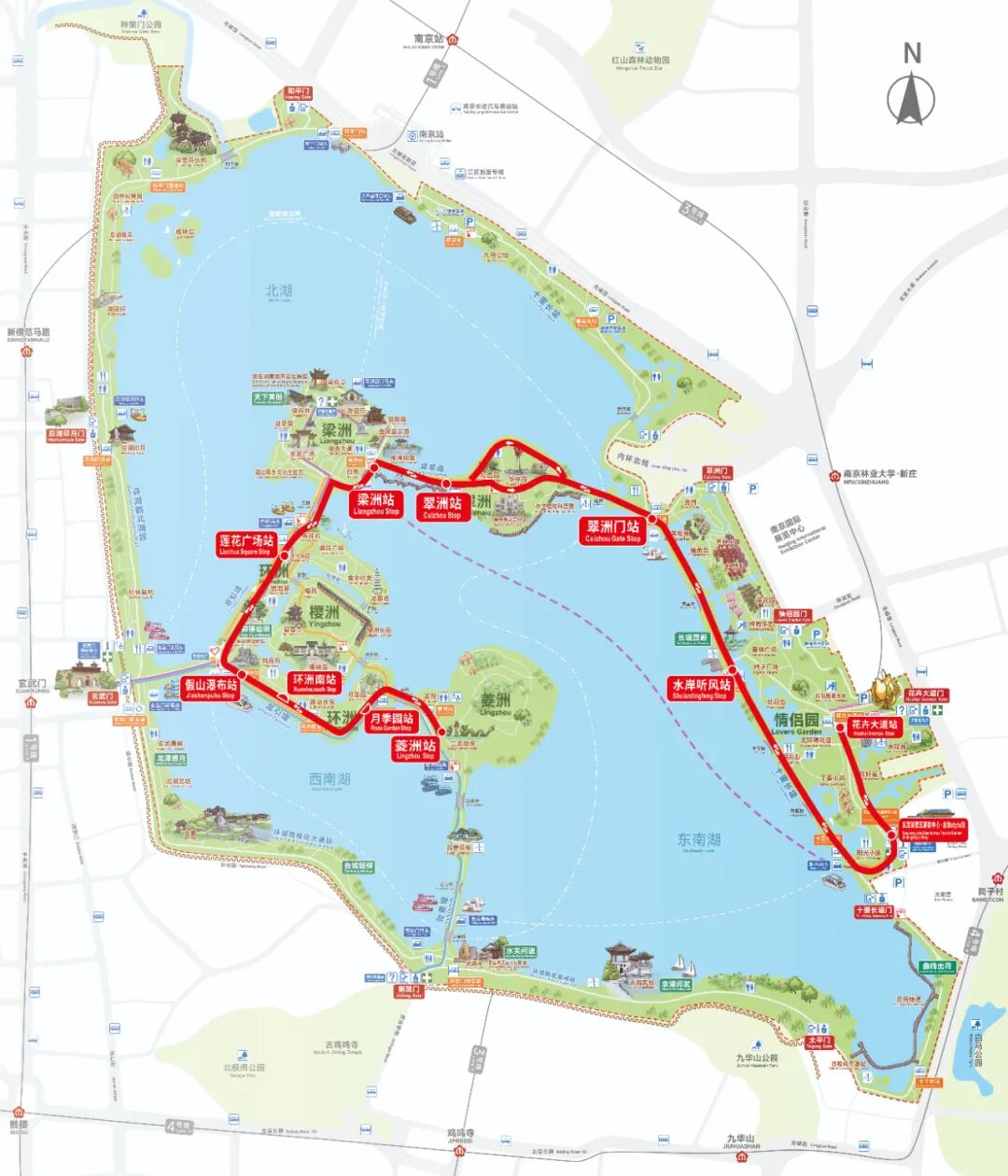 文明旅游,你我同行!玄武湖景区内禁止携带宠物入园,禁止垂钓,禁止偷猎野生动物、采摘植物及采食野生菌类,禁止轮滑、滑板、乞讨、算命、噪声污染,禁止破坏景物和设施,请各位游客配合景区管理,自觉抵制破坏景区资源、设施、秩序等不文明行为,共同守护美丽风景。违反者将根据《南京市玄武湖景区保护条例》予以处罚。