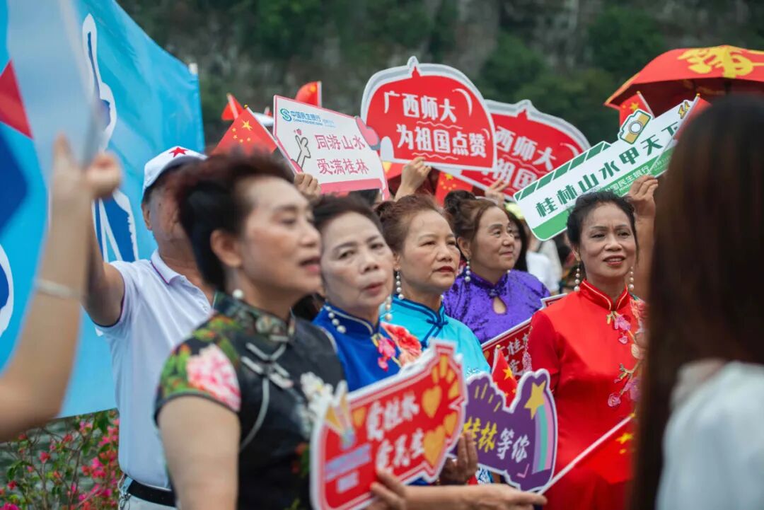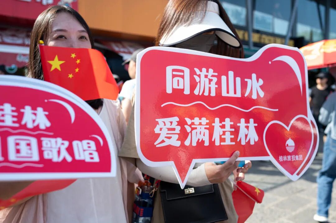 游客们手里举着发放的小国旗和“同游山水 爱满桂林”活动手牌