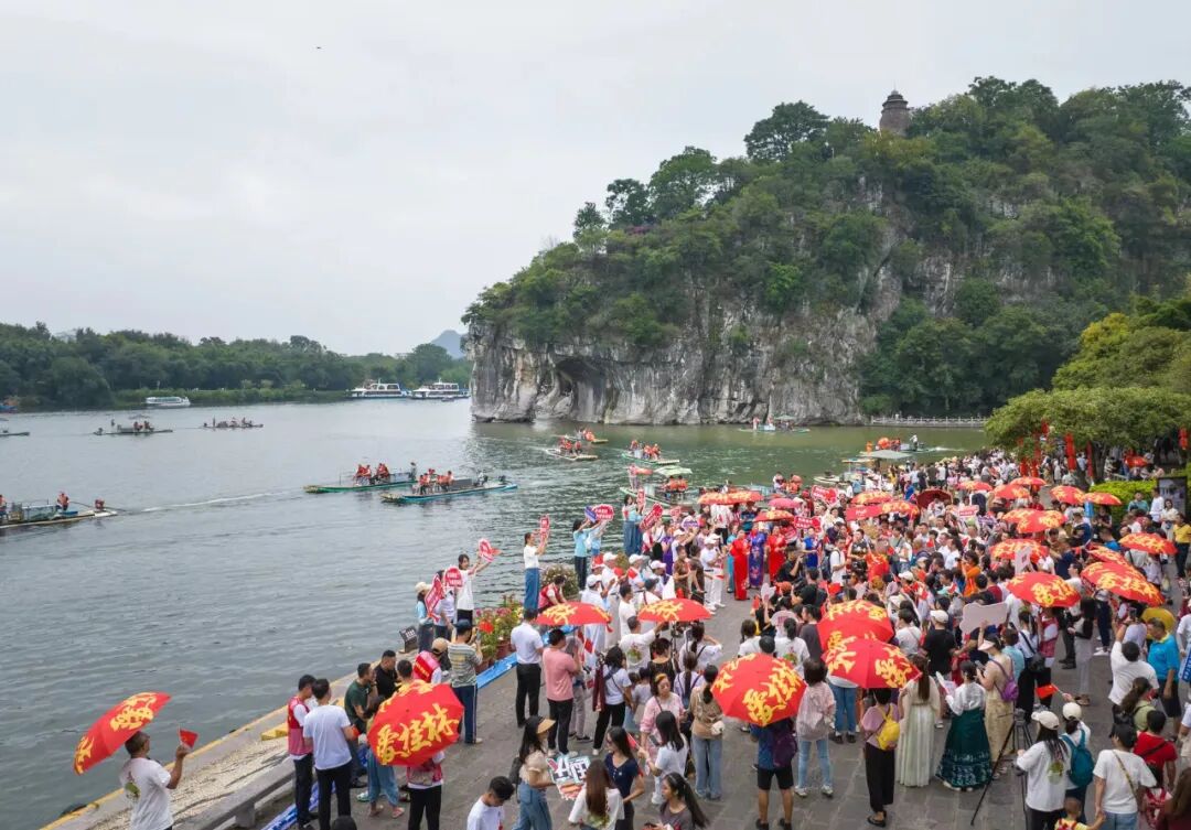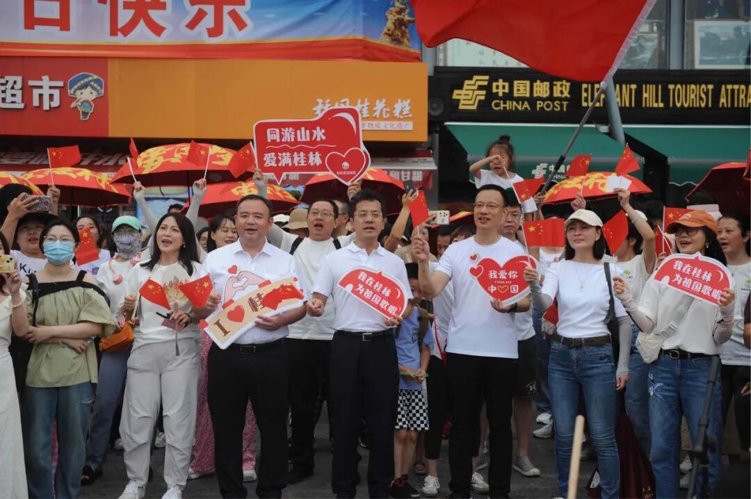 曲《我和我的祖国》,每个人手里的小国旗跟随着节奏左右挥舞,在桂林地标“象鼻山”旁形成了一股翻腾的“红色浪潮”,映衬得桂林山水更加的秀丽壮美。