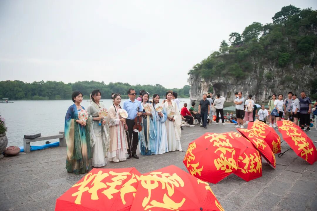 “我将梦你所梦的团圆,愿你所愿的永远,走你所走的长路,这样的爱你啊……”国庆正当时,象鼻山边上,伴随着街头表演者理宁奏出的小提琴旋律,身着中华民族传统服饰的高校学生们唱起了《如愿》。由桂林旅游投资集团有限公司、中国民生银行桂林分行及广西师范大学音乐学院联合举办的“同游山水 爱满桂林”公益艺术会正式拉开帷幕。