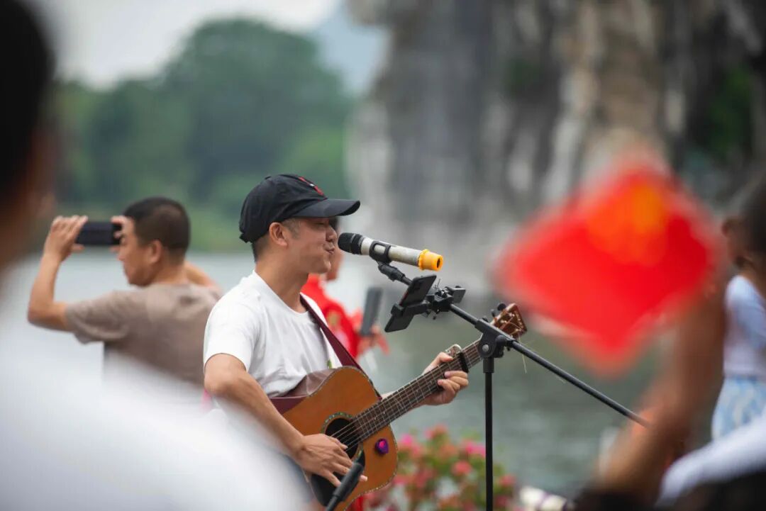 此次小型艺术会以“歌颂祖国华诞 唱享山水桂林”为主题,邀请了民间组织桂林市紫竹艺术团、桂林街头艺术表演者们进行公益演出,通过以桂林人熟悉并喜闻乐见的形式演绎,使得《我们的中国梦》等经典歌曲充满了桂林风情。桂林街头知名“11路民谣”组合一边用随处可见的塑料桶击打出《我爱你中国》的鼓点,一边用吉他吟唱的精彩演出赢得了围观市民和游客的连连掌声。在他们的带动下,全场集体高呼三声“我爱你中国”,将国庆节日氛围推向了至高点。