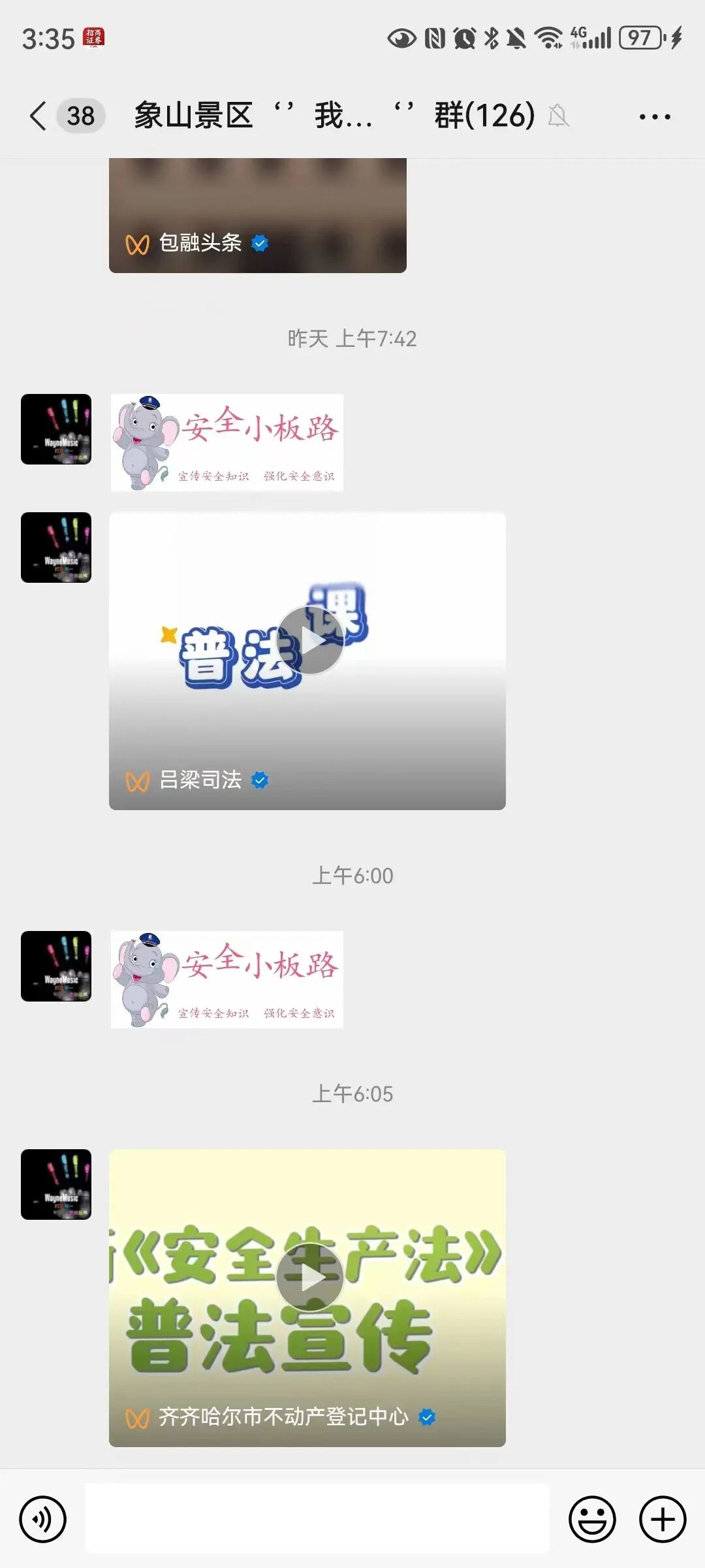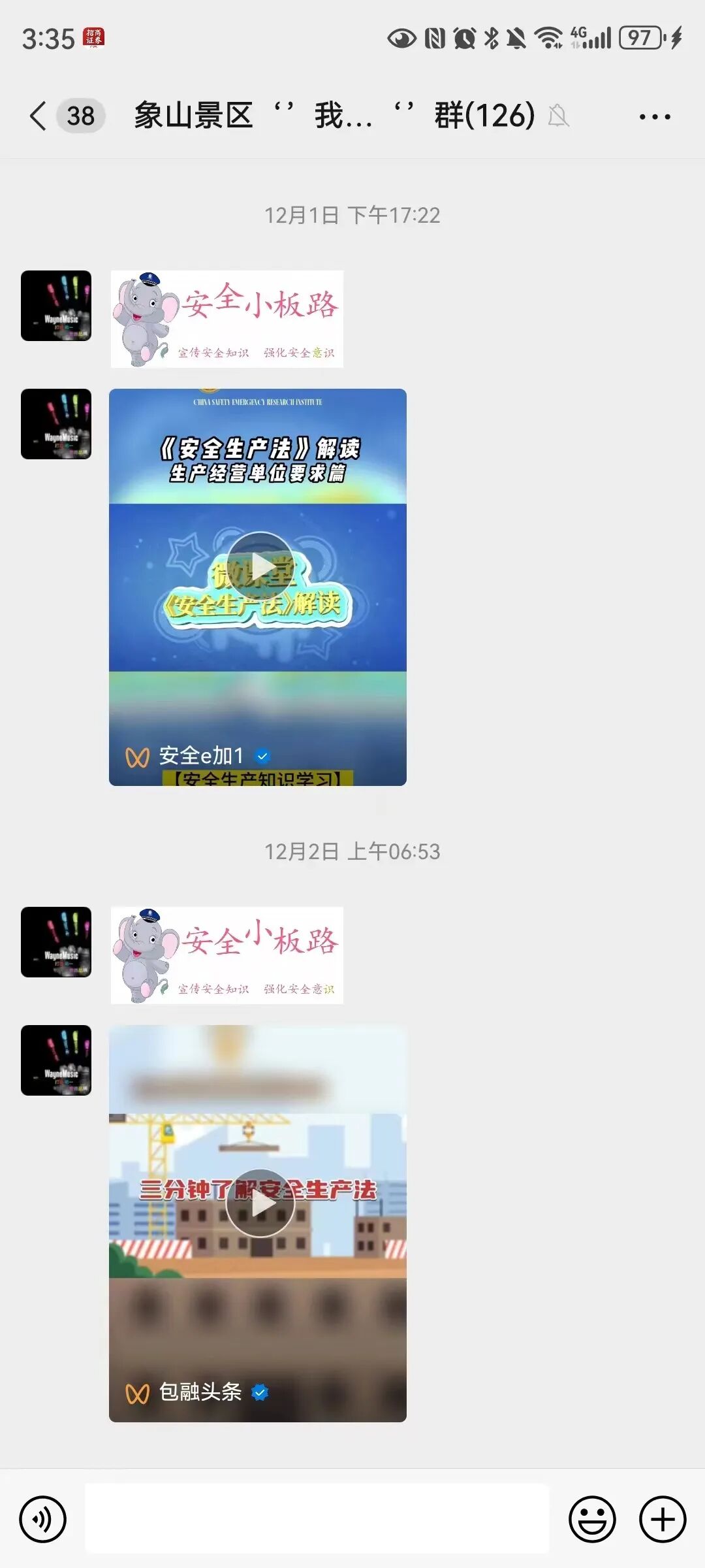 通过景区微信群,及微信公众号发布安全生产法律法规小知识及安全警示教育视频,向景区员工宣传安全生产法规重要性,使景区员工知法、懂法、守法意识大大增强。