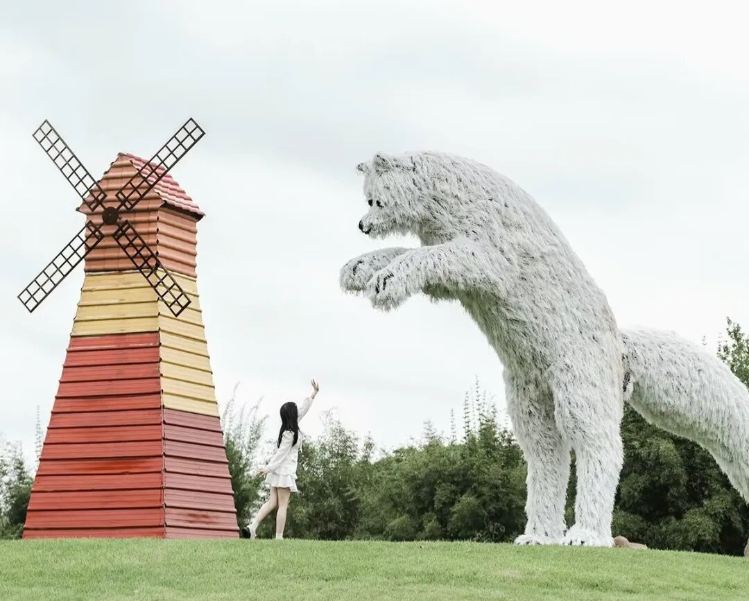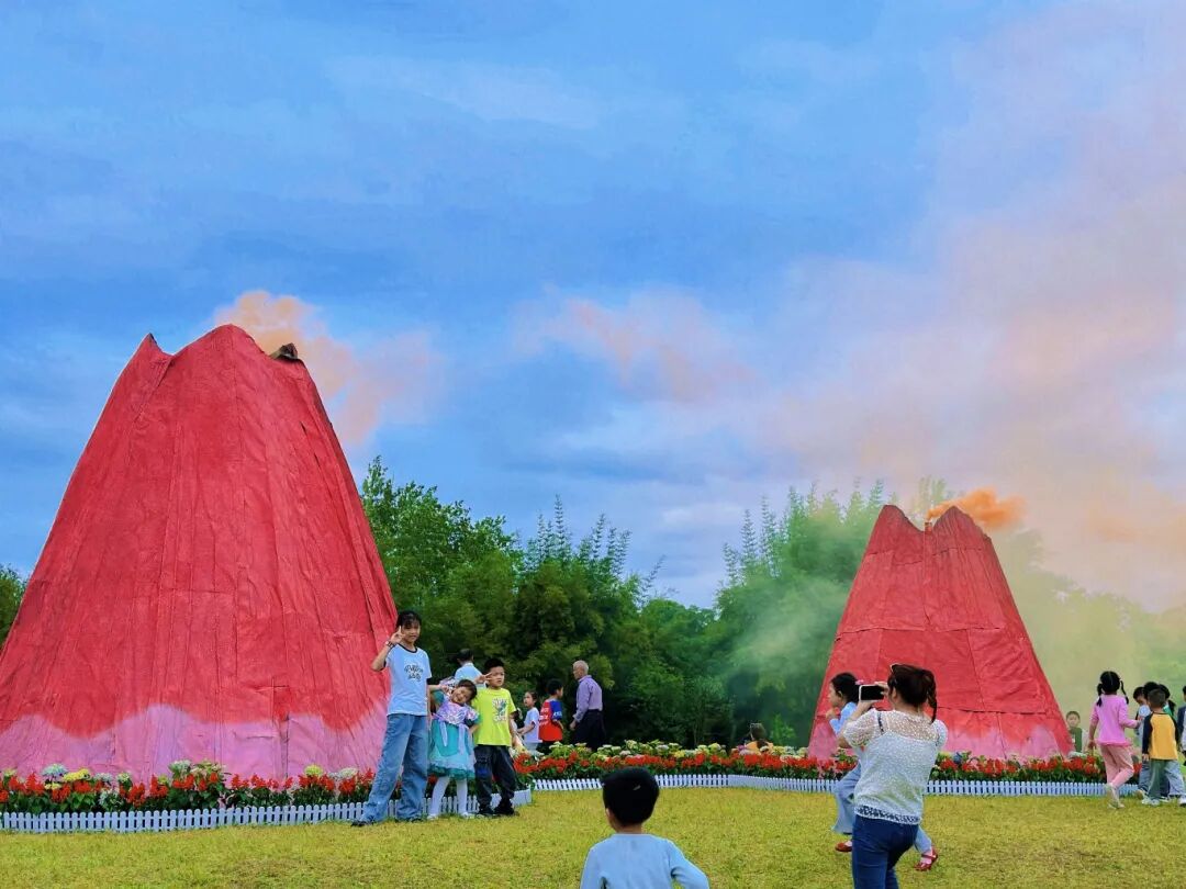 走进园博园,绿荫匝道,鲜花盛开,一路向上来到草坪,巨型粉色火山彩烟秀映入眼帘,高低起伏、错落有致的稻草人让人仿佛走入了一个童话世界。这里天蓝草碧,孩子们在草地上奔跑嬉戏,放风筝、玩游戏,欢笑声声,游客以一种欢喜放松的方式享受美好的亲子时光。