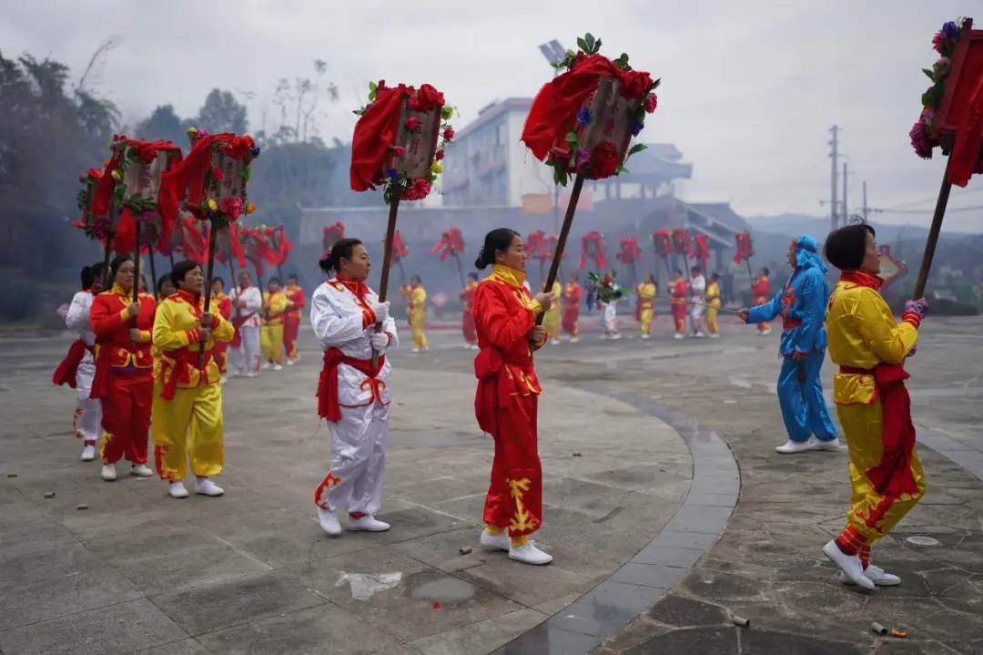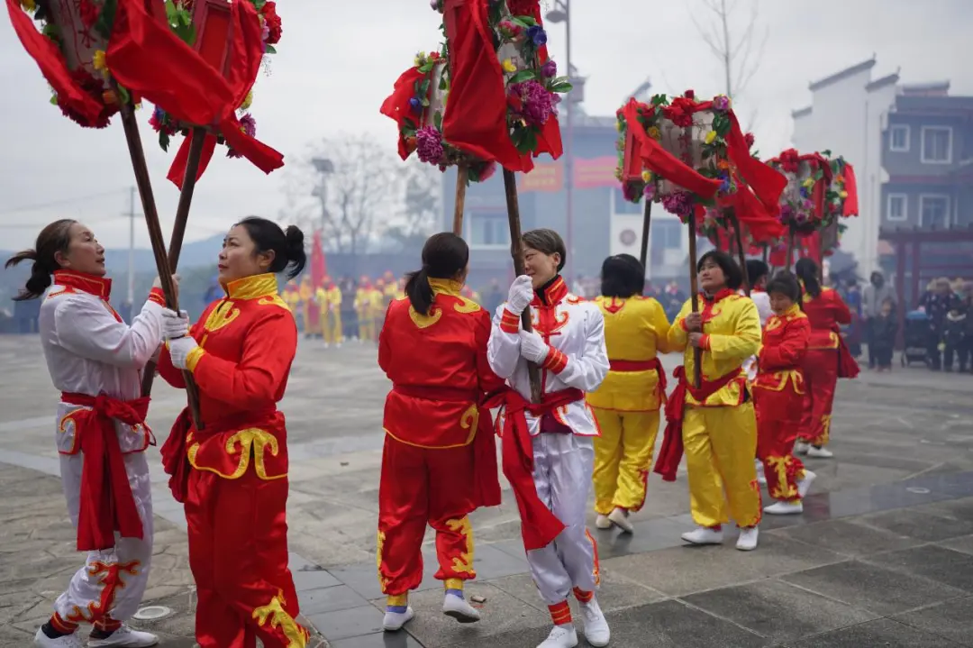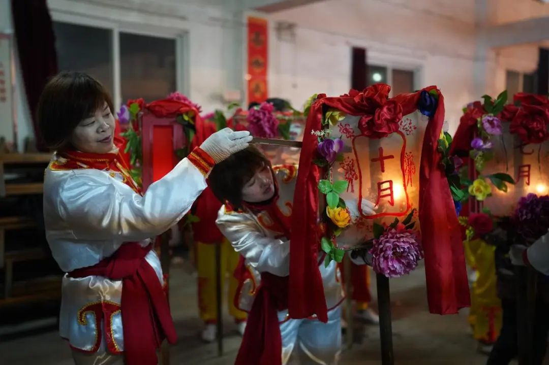 “一条龙”即三十六盏灯为一队式排阵走动,“绞铁索”即牌灯队变成二组,互相交叉穿行。“转螺旋”即牌灯队变成三组,其中二组以旋转式内卷式收缩,呈8字型,另一组从中穿梭。“成牌”即“绞铁索”结束时,按月牌、节气牌(一月两节气),三牌一组,成品字型排列组合,在场上踏小步走动。