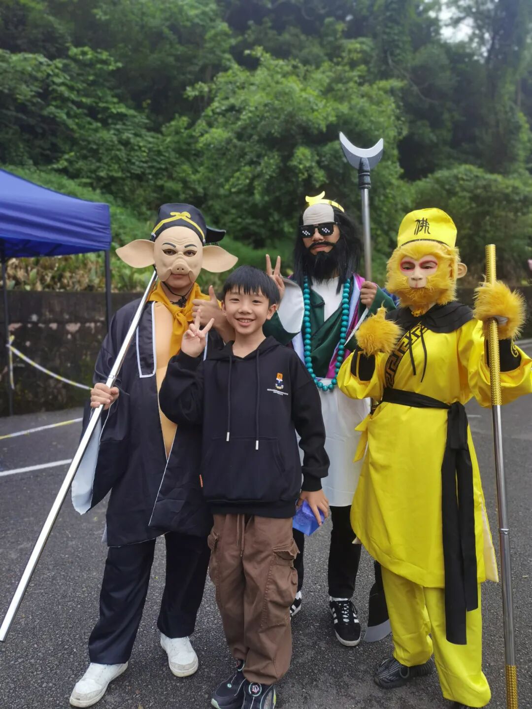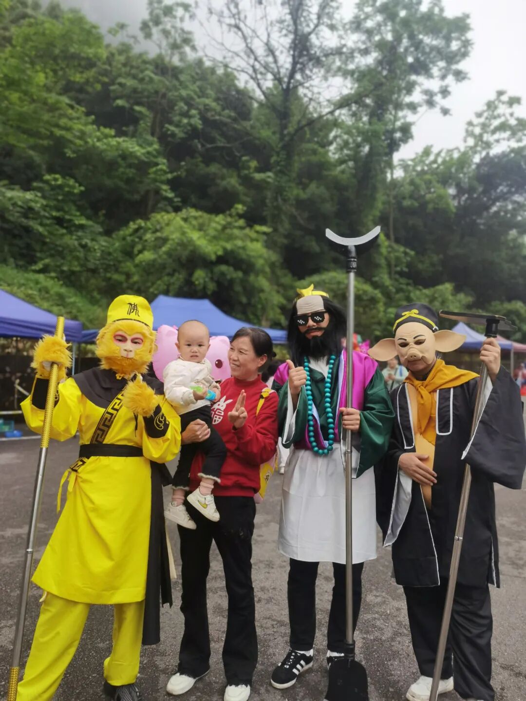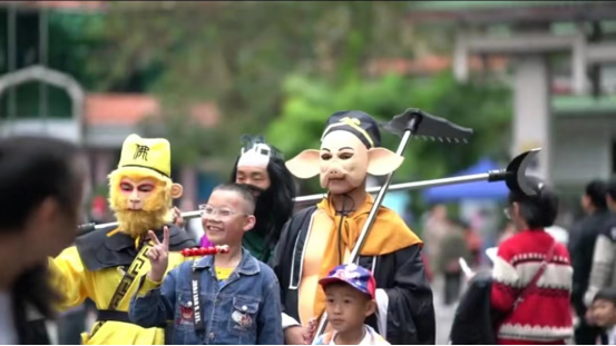 景区的步道上空,五彩缤纷的油纸伞与自然景色结合得相得益彰,韵味十足,惹得市民们纷纷驻足拍照留念。市民们一边观景,一边忙着与《西游记》里的孙悟空、猪八戒、沙僧等一起合影留念,现场一派热闹、欢乐的气氛。