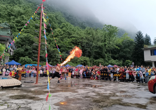 “再来一个!”一阵阵欢呼声从丰鱼岩岩洞门口广场传来。这里正拉开一场别开生面的“野人部落”绝技表演,在神秘而庄重的音乐中,非遗传承人上刀山、下火海、喷火、吞火、徒手拉汽车等,为游客带来一场惊险刺激的“非遗”表演。