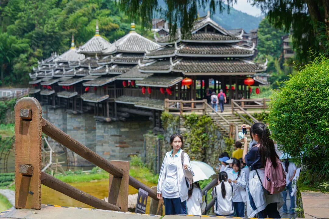 这里的侗族建筑风格独特,古朴素净,素有千年侗寨,秘境程阳的美称,世界四大历史名桥之一的程阳永济桥就坐落于此,师生们也纷纷与程阳永济桥进行合影纪念。