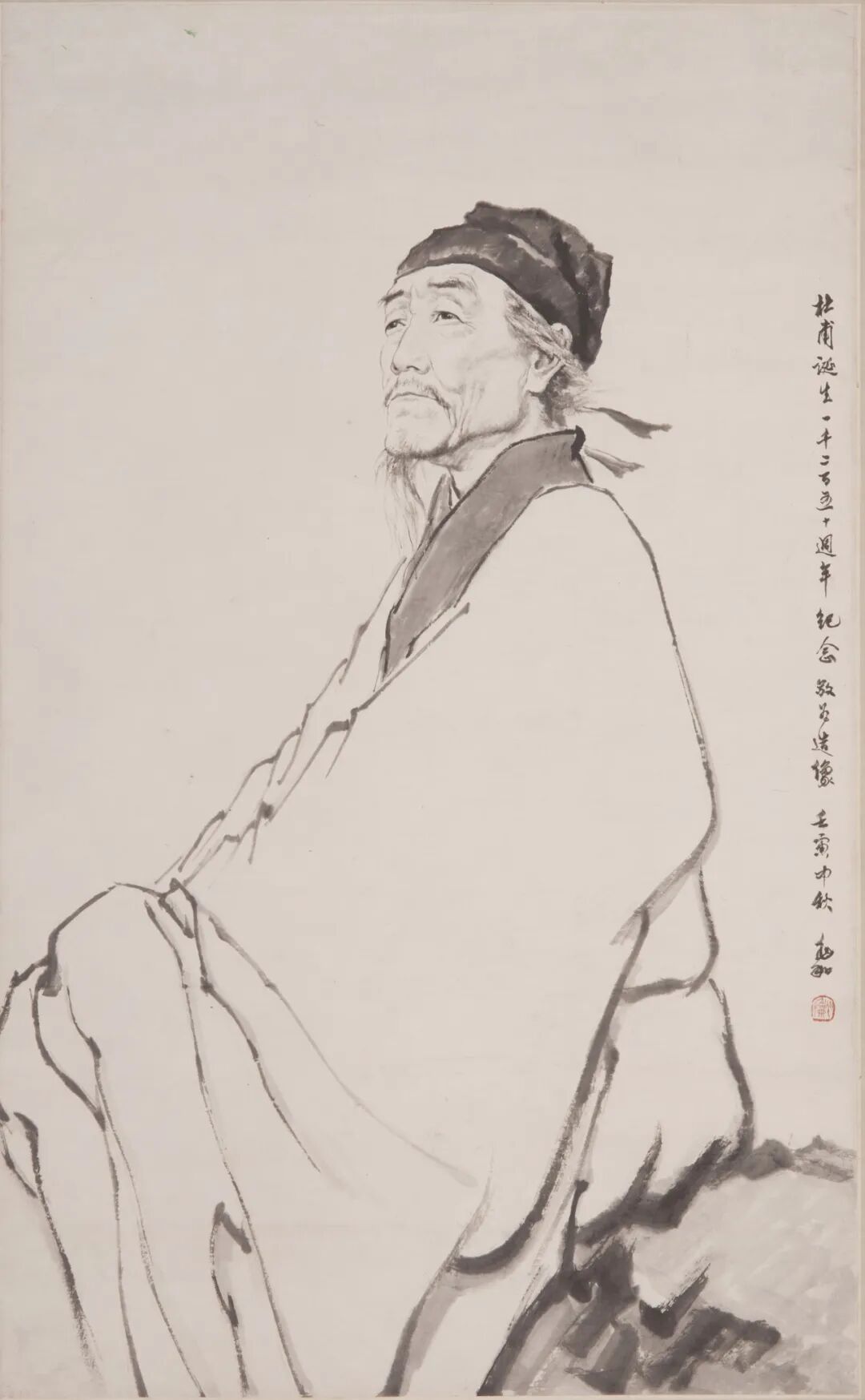 这幅《杜甫像》是蒋兆和于1962年为纪念杜甫诞生一千二百五十周年而绘制的。由于该画作被收入教科书,得以广泛流传,进而成为国人心中杜甫的“标准照”。鲁迅曾言:“杜甫似乎不是古人,就好像今天还活在我们中间似的。”用这句话来形容蒋兆和的《杜甫像》,可谓恰如其分。