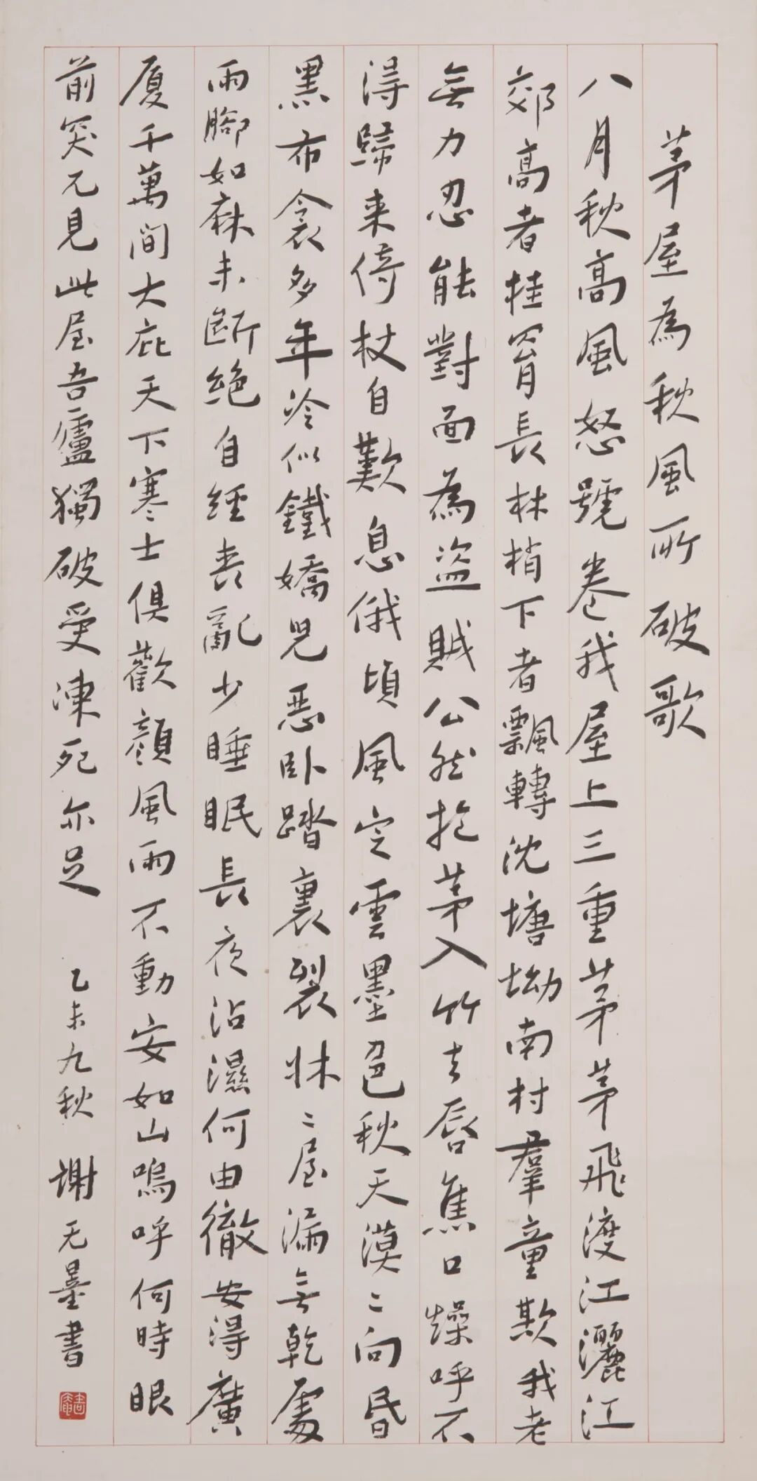 这件《茅屋为秋风所破歌》字轴是1955年杜甫草堂纪念馆刚刚成立时谢无量写的。他曾两次书写《茅屋为秋风所破歌》,另外一件作于1956年。