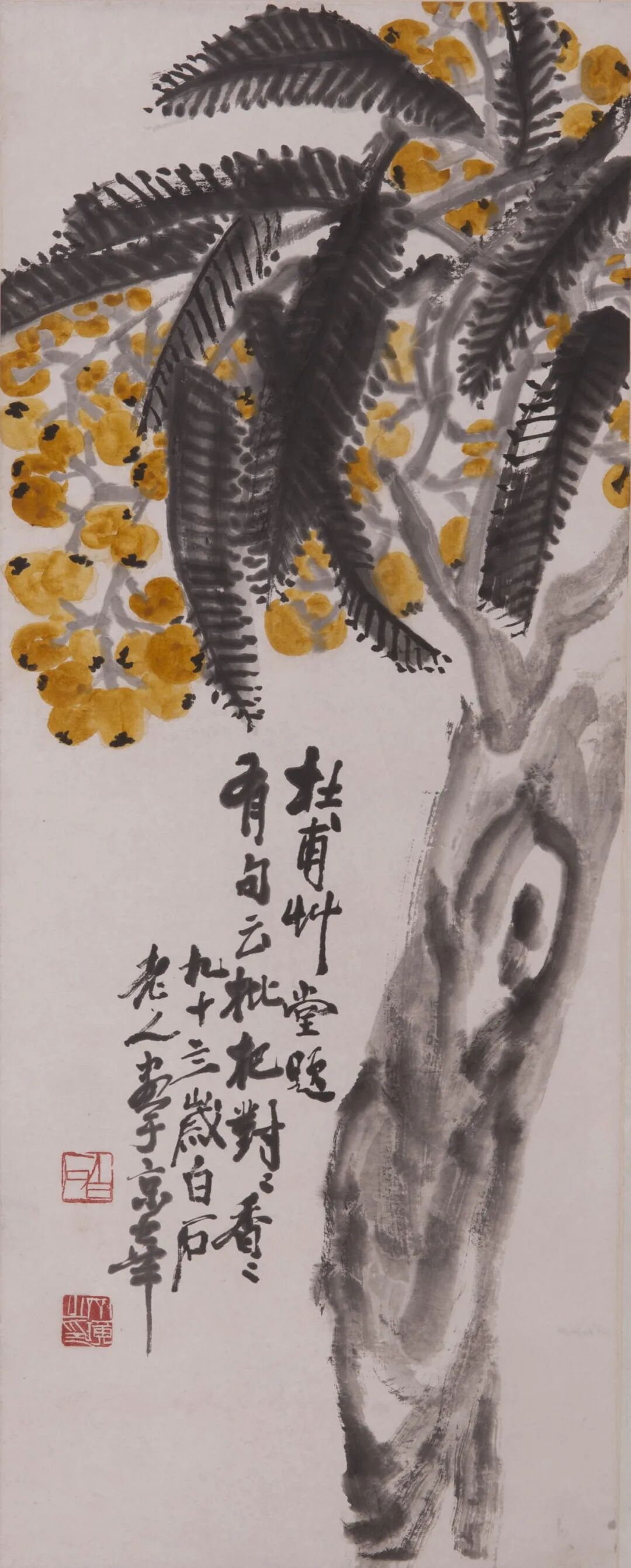 款识:杜甫草堂题,有句云“枇杷对对香”,九十四岁白石老人画于京华。