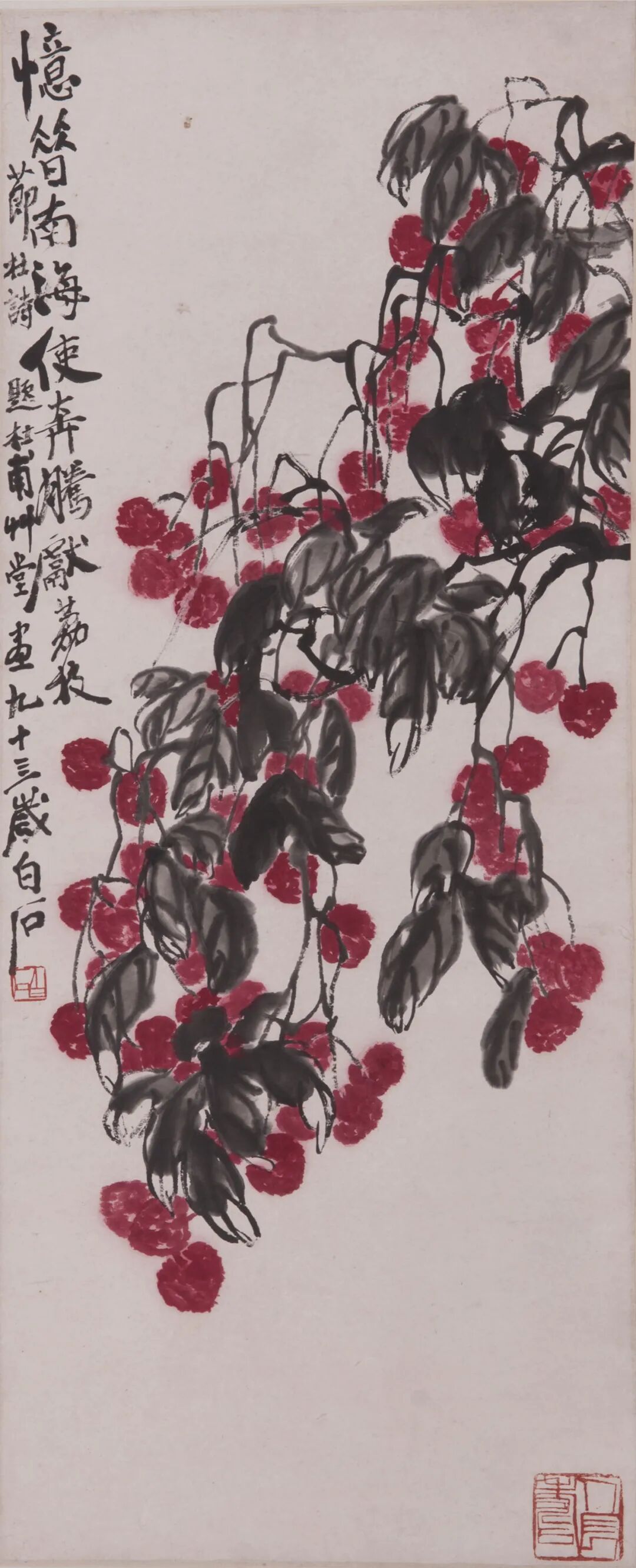 白石老人还以杜诗《病橘》中“忆昔南海使,奔腾献荔枝”的意境创作了荔枝图轴。他在处理这件诗意画作品时,不去描写橘之病,转而描述一树欣欣向荣的荔枝,以荔枝的丰茂,暗喻橘的枯败及百姓的民不聊生。