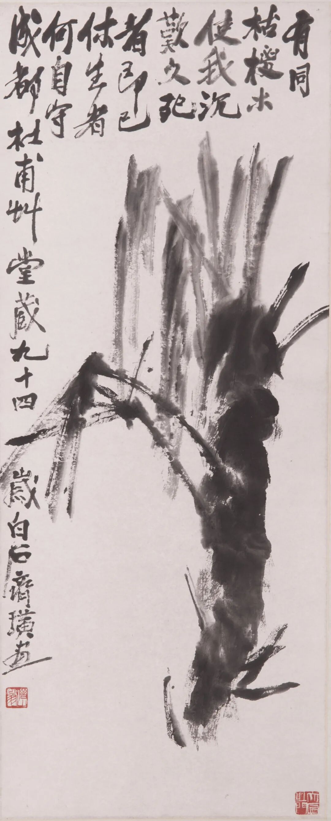 款识:有同枯棕木,使我沉叹久。死者即已休,生者何自守。成都杜甫草堂藏,九十四岁白石齐璜画。