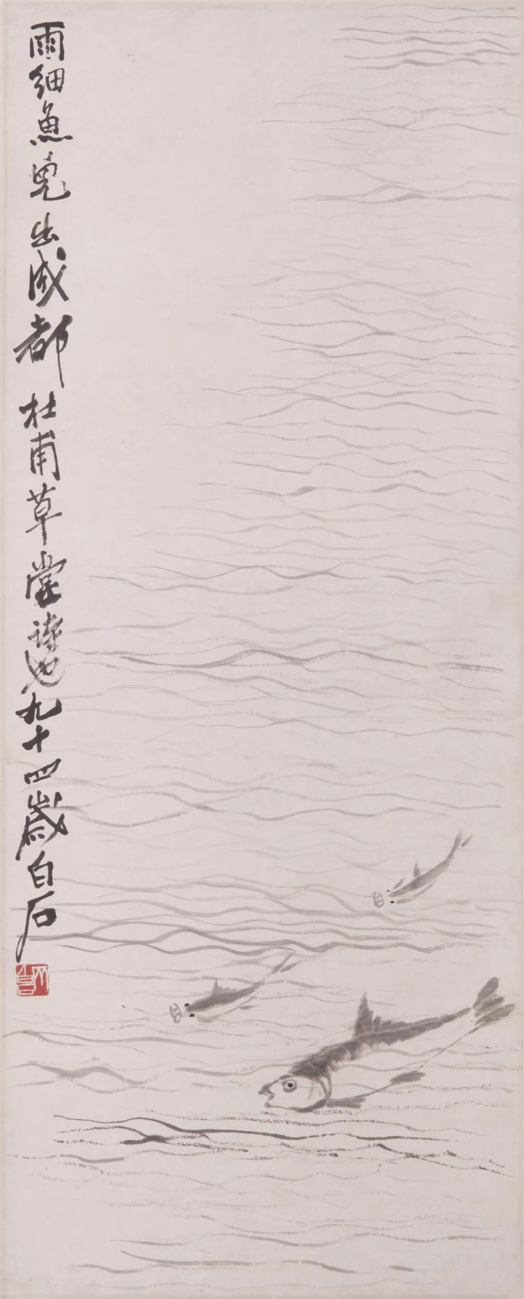 款识:雨细鱼儿出。成都杜甫草堂诗也,九十四岁白石。