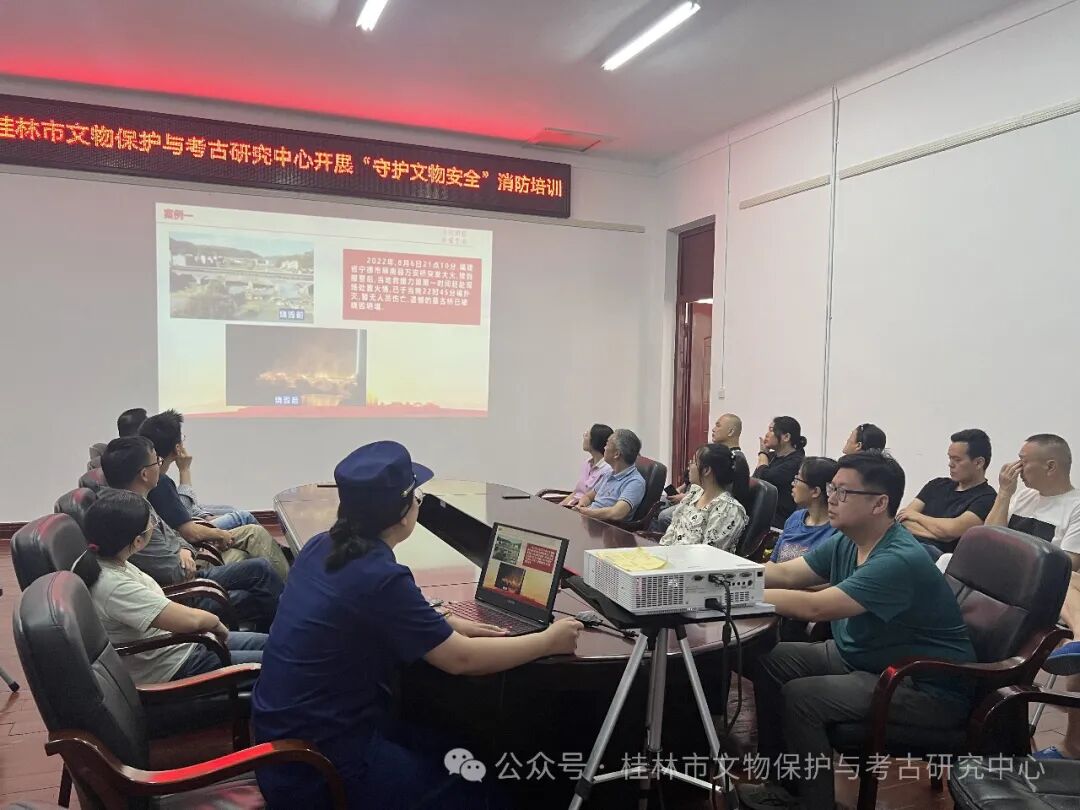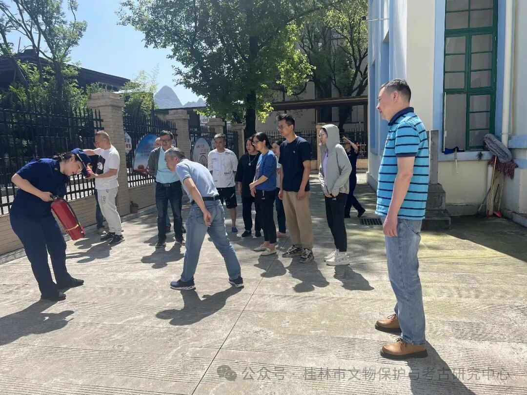 为进一步加强文物安全工作,夯实文物安全责任,2024年5月14日上午,桂林市文物保护与考古研究中心在广西人民革命大学旧址(广西壮族自治区文物保护单位)组织开展“守护文物安全”消防安全演练。市文保中心工作人员、值班人员等20余人参加培训和演练。