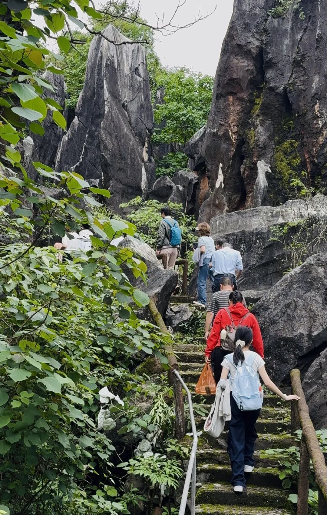 贺州玉石林景区距离市区18公里,观赏景点一百余处,是国家4A级景区,是中国汉白玉地质奇观。景区形成于一亿多年前的侏罗纪时期,是一片十分罕见的由汉白玉石柱、石笋组成的“玉石林”。景区内峰丛间石芽裸露、奇峰突兀,石笋石柱、地槽漏斗、狭缝密布,成就了“南国雪原”“石林迷宫”“一线天”等众多的奇异自然景观,游于林中,如入仙境,大自然的鬼斧神工令人叹为观止,千百年的故事传说令人惊叹感慨。