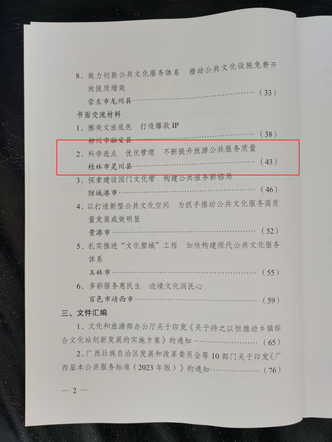 我局编写的“科学选点,优化管理,不断提升旅游公共服务质量——灵川县旅游厕所管理经验材料”被纳入《2024年全区为民办实事工程文化惠民项目暨文化和旅游公共服务高质量发展推进会——材料汇编》中。